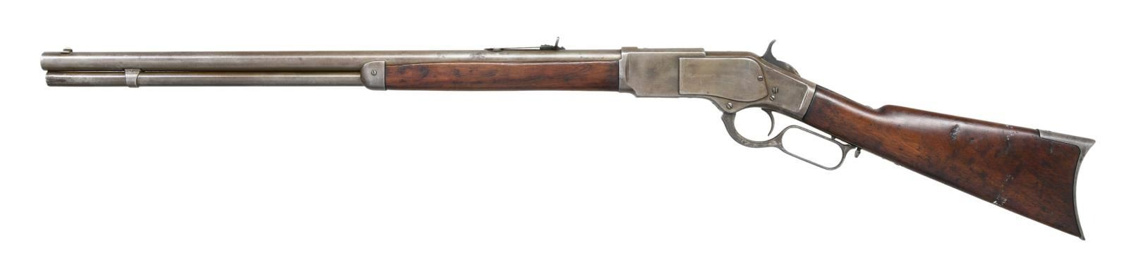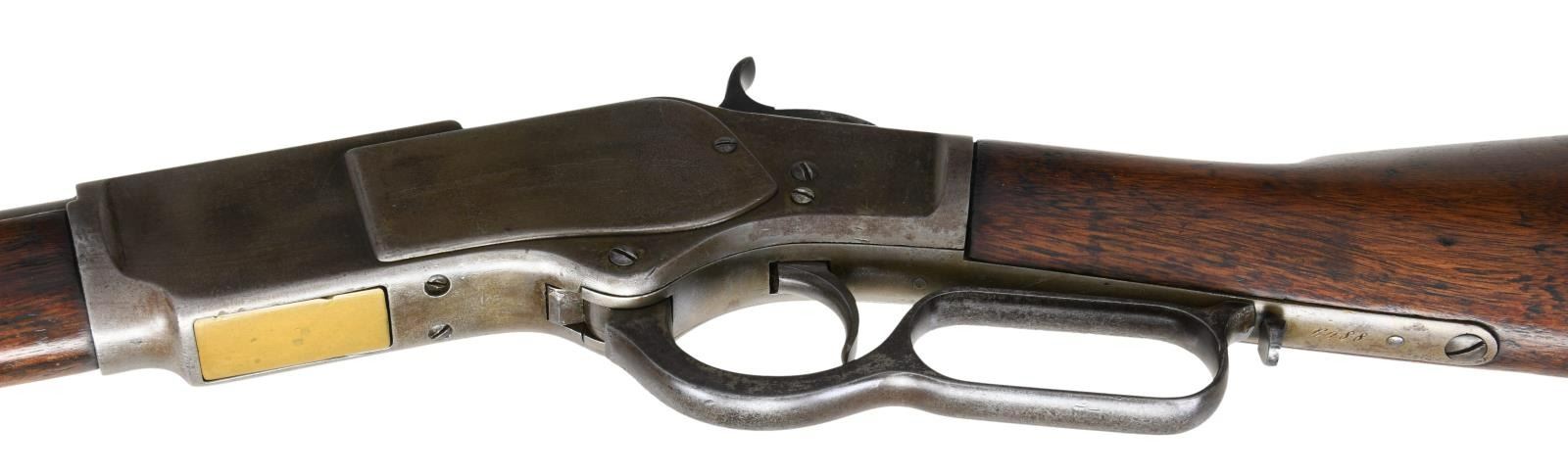 Cal. 44 WCF. S# 6088. Bbl. 24" round (01-24826/DS). Sporting front sight w/ replacement sporting rear sight. Full length mag. Mortised thumb-print dust cover. Walnut forearm & straight grip stock w/ crescent steel buttplate. Mfg. 1875. CONDITION: cleaned gray metal w/ gray coloration indicating touch-up finish. Heavily sanded & refinished wood. Stock is cracked through wrist area w/ chips along both sides of the forearm channel. Pitted bore w/ largely intact rifling. (01-24826/DS). ANTIQUE. $2,500-3,500.