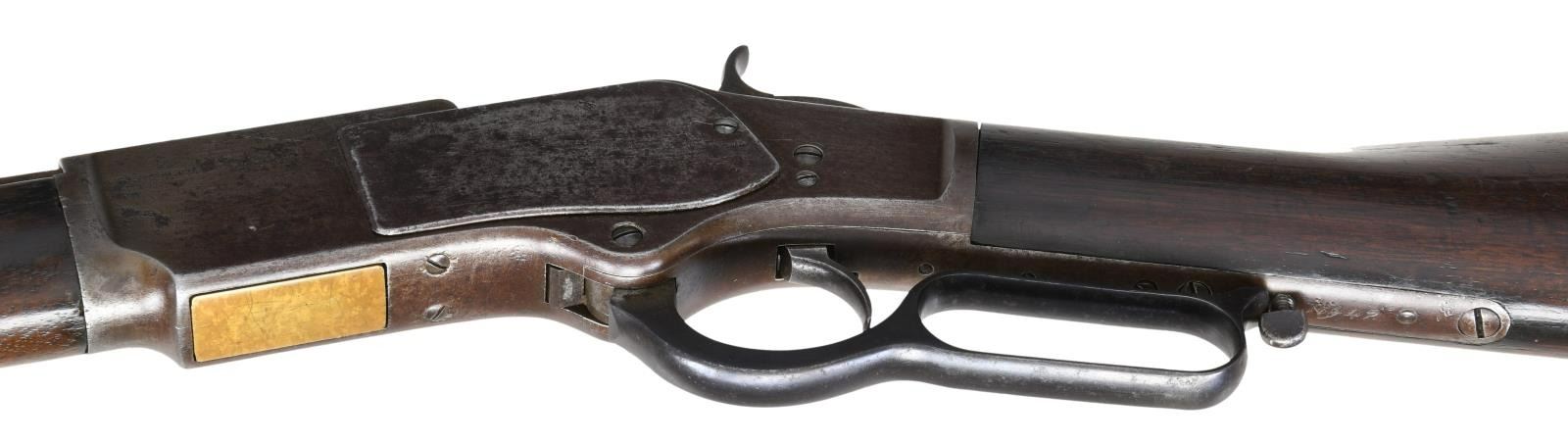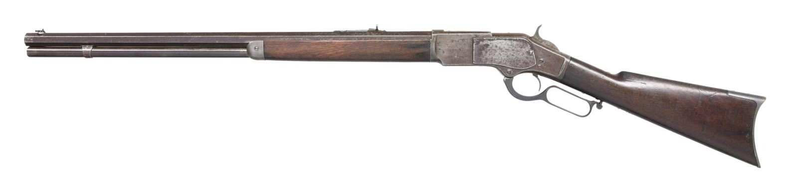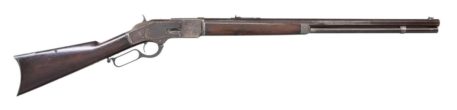 Cal. 44 WCF. S# 11942. Bbl. 24" octagon. Combination front sight w/ elevator adj. sporting rear sight. & Full length mag. Action has round thumb print mortised dust cover. Walnut forearm & straight grip stock w/ crescent steel buttplate. Mfg. 1876. CONDITION: metal has general brown appearance showing scattered pitting. Wood has added finish over numerous dents, scratches & marks. Forearm has an added wood repair on left side by tip w/ a hairline crack along the bottom. Pitted bore retains sound rifling. (01-24833/DS). ANTIQUE. $3,500-5,000.