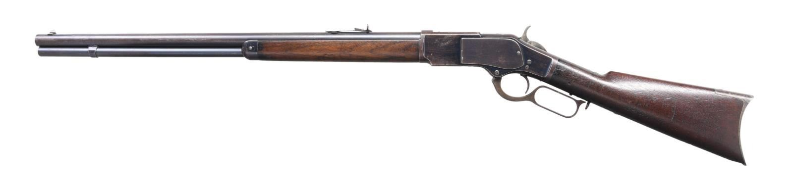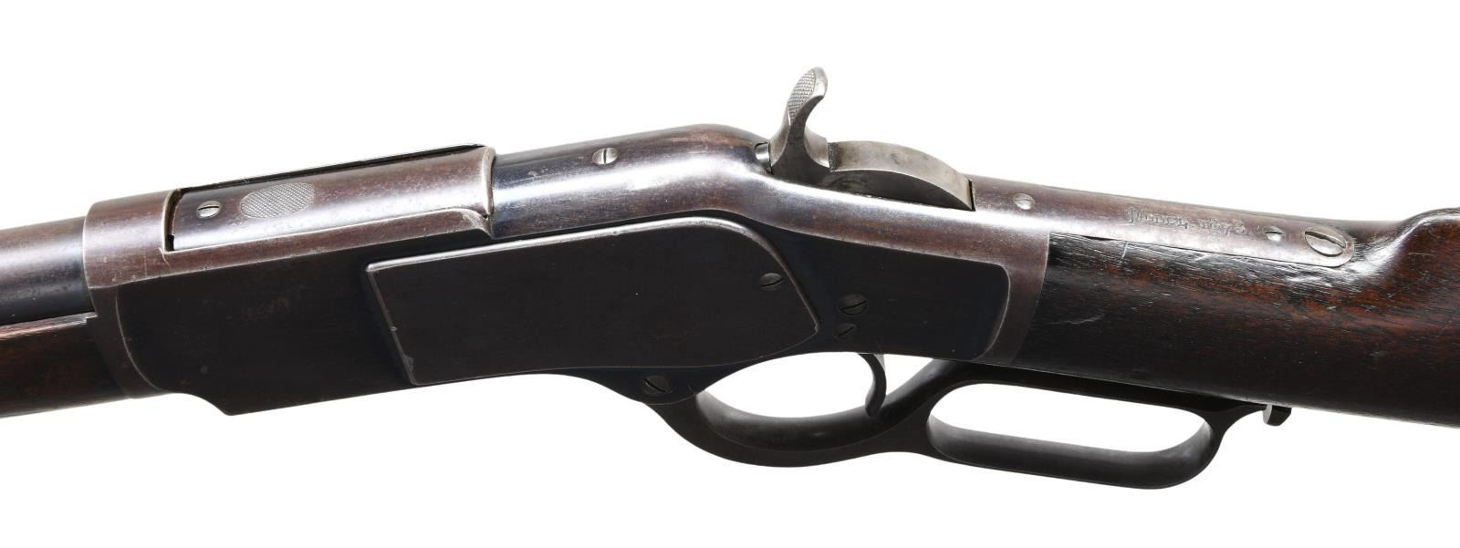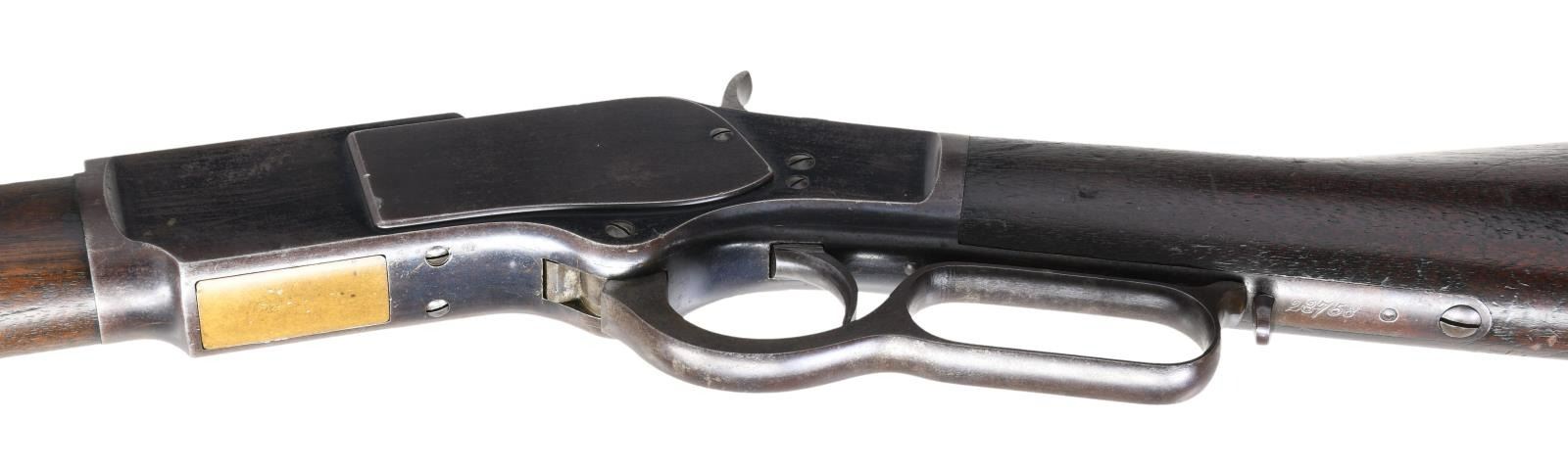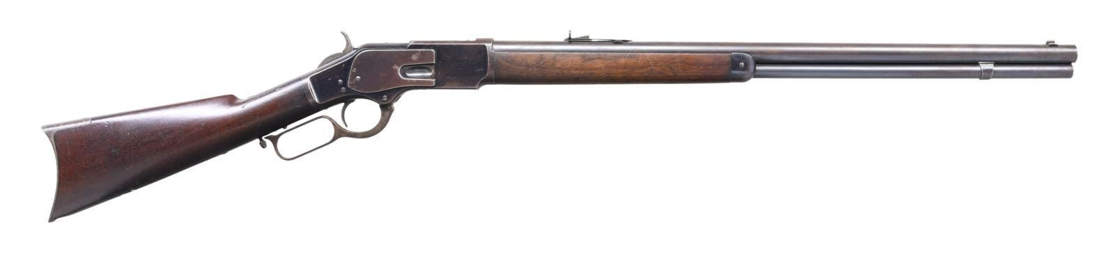 Cal. 44 WCF. S# 23758. Bbl. 24" round w/ sporting sights. Full length mag. Action has mortised thumb-print dust cover. Walnut forearm & straight grip stock w/ crescent steel buttplate. Mfg. 1878. CONDITION: over 70% dull fading blue showing handling marks & spots of wear. Unsanded wood has dark worn finish showing numerous scratches, marks & small dents. Pitted bore retains largely intact rifling. (01-24829/DS). ANTIQUE. $4,000-6,000.