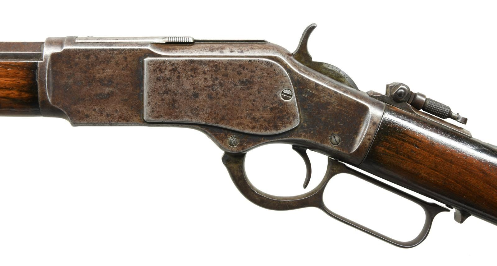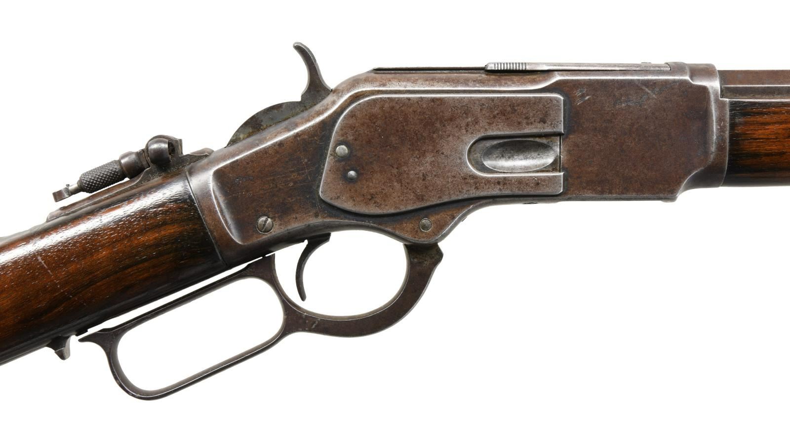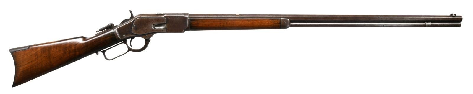 RIFLE. Cal. 32 WCF. S# 466749B. Bbl. scarce 30" octagon w/ full length mag. Combination front sight, polymer filler in rear dovetail w/ combination tang sight. Walnut forearm & nicely grained straight gripped buttstock w/ crescent steel buttplate. Mfg. 1894. UNATTACHED ACCESSORIES: Cody Firearms Museum records check detailing the following information, "Type: Rifle. Caliber: 32. Barrel Type: Octagon. Barrel Length: 30 inches. Trigger: Plain. Received in warehouse on February 15, 1894. Shipped from warehouse on September 10, 1894, Order number 21004". CONDITION: metal has faded to a light brown appearance showing scattered spots of pitting. Sanded & refinished wood shows handling marks & small dents. Stock has a crack extending from left side of top tang. Good mechanics. Bore has a dark frosted appearance over worn rifling. (01-23416/DS). ANTIQUE. $2500-3500.