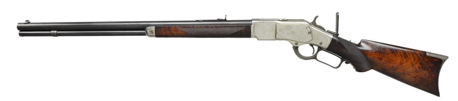 RIFLE. Cal. 44 WCF. S# 148023A. Bbl. 24" rnd. with bead front sight, sporting rear sight and scarce model 1873 folding tang sight that has peep disk above protected staff and uses a single mounting screw with pin above rear sight screw hole. Adj. disk is not present, sight is marked "PT. JUNE 19,1891". Full length mag. Third Model action with case colored hammer and lever. Receiver, sideplates, carrier, dust cover, forearm cap and trapdoor crescent buttplate are nickel finished. Forearm and pistol grip stock with ebony inlay have factory style H hand checkering. Inside of top tang channel stamped "P / 5358". Left inside of lower tang marked with matching assembly # "5358" followed by "XX" wood grade marking & "R". UNATTACHED ACCESSORIES: Cody Firearms Museum Records check stating the following information "Type: Rifle / Barrel Type: Round / Trigger: Plain / Checkered stock, Pistol grip / Nickel trim / Received in warehouse on April 12, 1884. / Shipped from warehouse on April 12, 1884, Order number 11456. CONDITION: bbl. and mag. tube retain over 90% dull lightly faded original blue. Action and trim have over 70% factory nickel showing areas of flaking on right sideplate and buttplate with smaller spots of freckling and scratches in other areas. Original wood finish shows some wear and age darkening with scattered light scratches and marks. Checkering shows light wear. Crisp mechanics. Front sight has broken bead. Bore is generally bright with sound rifling showing scattered spots of light pitting. (01-17954/DS). ANTIQUE. $18,000-22,000.