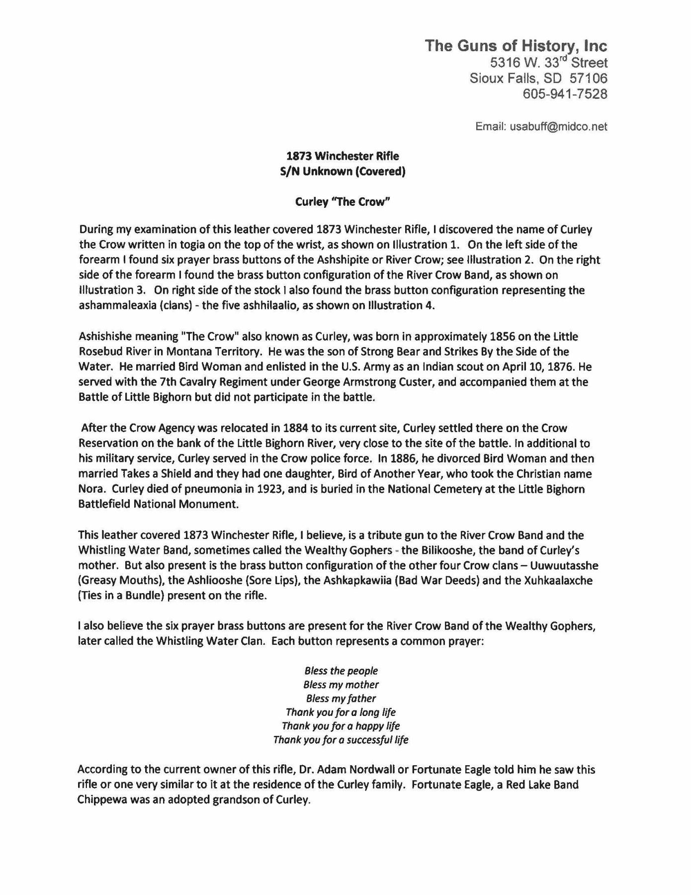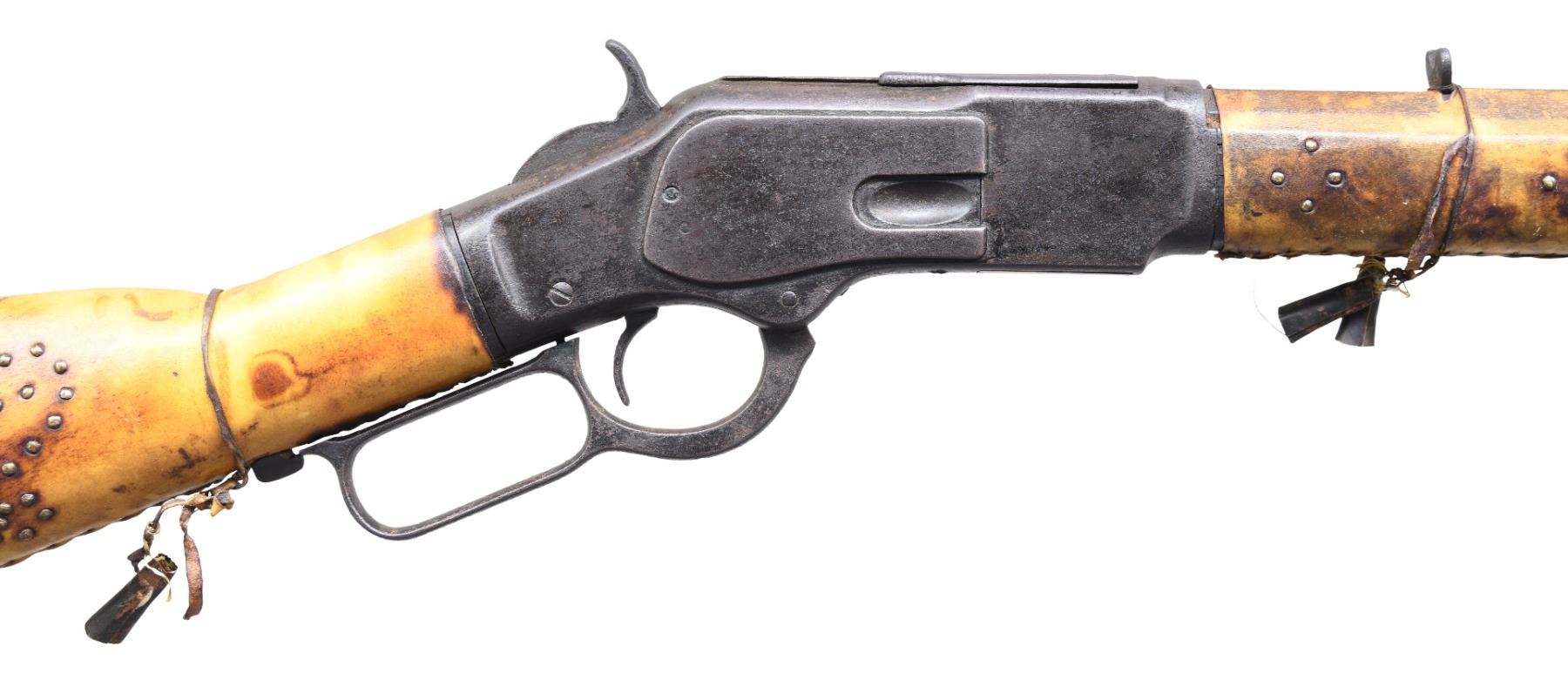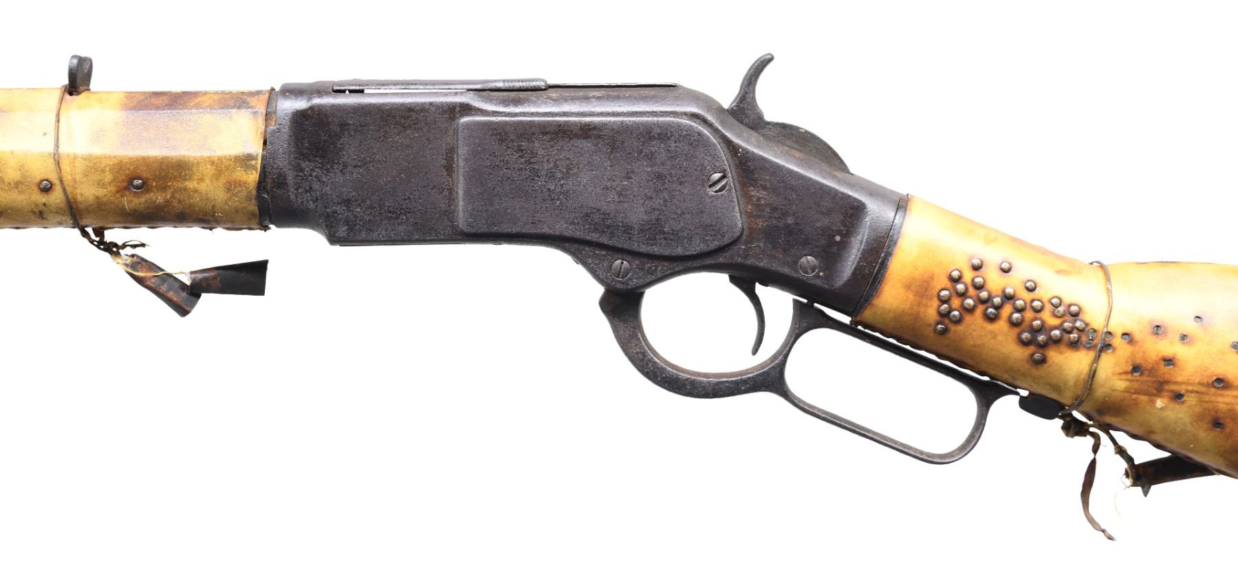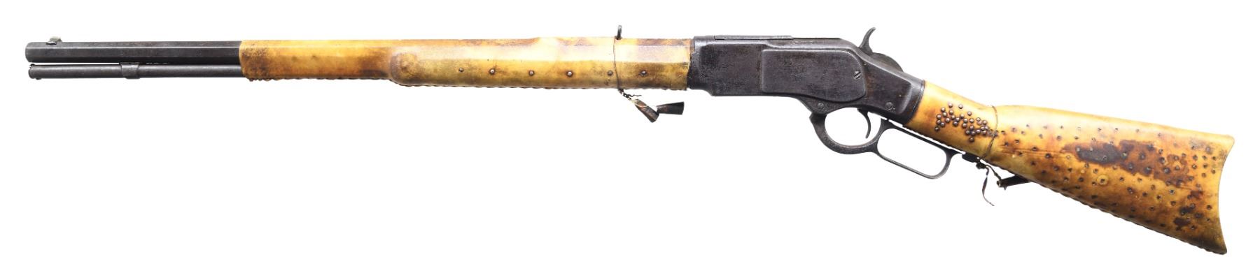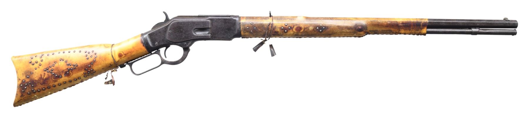 WRAPPING. Cal. 32-20. Bbl is 24" oct w/ full length magazine. Stock and crescent steel buttplate have stitched rawhide wrapping with extensive brass tack ornamentation. Forearm and first 15 1/2" of bbl and mag tube have stitched rawhide wrapping w/ brass tack ornamentation. Small copper bells are held by leather wrappings around the wrist and around the forearm forward of the rear sight. UNATTACHED ACCESSORIES: letter from The Guns of History Inc. of Sioux Falls, SD dated May 8, 2019 and signed by Wendell Grangaard. Mr. Grangaard examined this rifle and its Togia markings. Togia is the pictorial language of the Plains Indians. Mr. Grangaard's interpretation of these markings attributes this rifle to a Crow Indian known as Curley who was born in approx 1856 on the little Rosebud River in Montana Territory. Curley enlisted as a scout for the US Army on April 10, 1876. He served w/ the 7th Cavalry under George Armstrong Custer accompanying them to the Battle of Little Big Horn, but did not participate in the battle. In addition to the letter are many pictures describing the markings that Mr. Grangaard observed on this rifle. CONDITION: visible metal exhibits a heavy brown patina w/ light general pitting. Rawhide covering over stock and forearm is in extremely good condition. Dust cover does not fully retract when action is cycled. Dark pitted bore w/ traces of rifling. (01-26507/DS). ANTIQUE. $5,000-7,500.