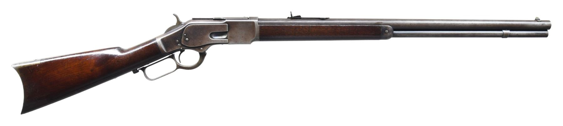 Cal. 44 WCF (44-40). S# 48841. Bbl. 24" rnd., with original sporting sights. Full length mag. Action has screw fastened dust cover rail. Blue finish, with case colored hammer and lever. Walnut forearm and straight grip stock, with crescent steel trapdoor buttplate. Mfg. in 1880. CONDITION: bbl. and action retain some dull fading blue in protected areas, with balance fading to gray, showing scratches, marks, and spotted surface corrosion. Hammer and lever retain traces of case colors. Stock and forearm have added finish over scratches and marks. Sound action. Lightly pitted bore retains sound rifling. PROVENANCE: Estate of Russell Dickerman. (01-27103/DS). ANTIQUE. $1,750-2,500.