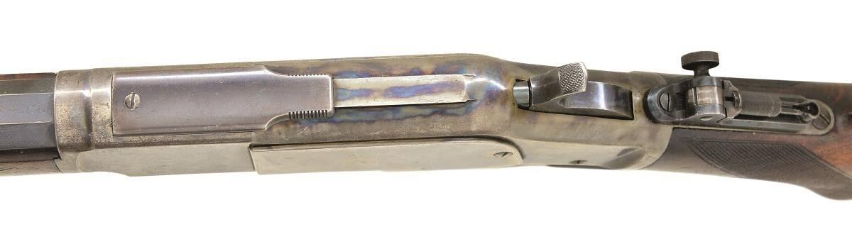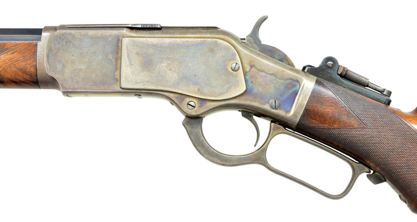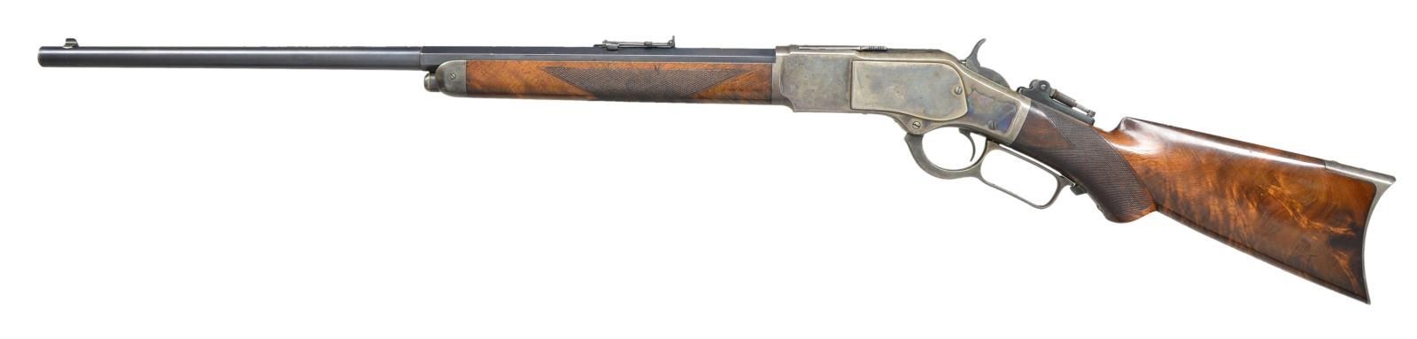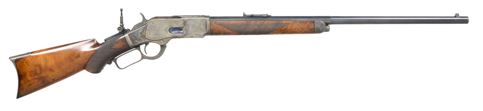 RIFLE. Cal. 38 WCF (38-40). S# 135546A. Bbl. 24" oct. to rnd. Button magazine. White bead sporting front sight w/ graduated leaf rear sight & Winchester combination tang peep sight w/ finely knurled post & heavy base. Forearm & pistol grip stock of XX fancy walnut w/ ebony grip insert, style H factory checkering & crescent steel trapdoor buttplate. Left inside of lower tang is marked w/ "XX" wood grade marking followed by "508", "38" & "R". Top tang channel of stock has corresponding markings. Inside toe of buttplate has matching no. "508". Mfg. 1883. CONDITION: bbl. retains 85% dull lightly faded blue w/ silvering on edges. Action shows over 70% case colors remaining vivid in protected areas w/ fading in carry areas & silvering on edges. Lever has faded to a dark patina showing sm. amounts of lightly visible case colors. Buttplate retains traces of case colors w/ balance fading to gray showing an area of corrosion at heel. Original wood finish & checkering show light wear w/ scattered scratches & marks. Sound mechanics. Bright bore retains sharp rifling. Left side lower tang screw is a replacement. (01-21197/DS). ANTIQUE. $10,000-15,000.