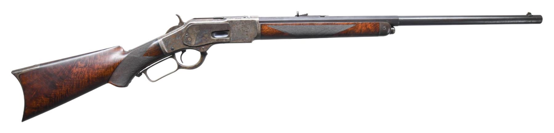 RIFLE. Cal. 44 WCF (44-40). S#. 97068A. Bbl. 24" octagon to round. Original sporting sights. Button magazine. Blue finish with case colored action. XX fancy black walnut forearm & pistol grip stock ebony grip insert, style H checkering and crescent steel trapdoor buttplate. Left inside of lower tang is marked with "XX" wood grade marking followed by assembly number "4419" and "R" for rifle. Top tang channel of the stock is stamped with a matching assembly number. UNATTACHED ACCESORIES: 4-piece cleaning rod held in stock compartment. CONDITION: Bbl shows 70% lightly faded blue with slight edge wear & spots of pitting. Top left of bbl approximately 6-3/4" from muzzle shows small area of cleaned pitting. Action & lever have 50% lightly visible case colors showing thru spotted dark corrosion. Unsanded wood has moderately worn finish & age darkening showing scattered handling marks. Sound mechanics. Bore retains sound rifling showing spots of pitting. PROVENANCE: The Esteemed Norm Greenberg Collection. (01-27696/DS). ANTIQUE. $7,500-12,500.