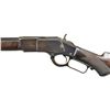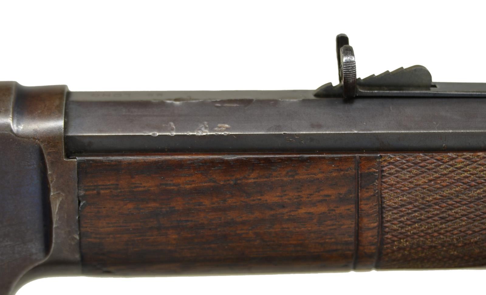Cal. 22 Long. S# 415511. Bbl. 24" octagon. Sporting front sight with lowered blade. Sporting rear sight with replacement elevator. Full length tubular mag. Blued finish with case colored hammer & lever. Walnut forearm & pistol grip stock with ebony insert & crescent steel buttplate. Left inside of lower tang has assembly # "11" followed by "CH". Top tang channel of stock has matching assembly # "11". Stock & forearm have added checkering. Forearm has unusual pattern with diamond at bottom & wide borders at front & rear edges. Stock checkering extends clear to top & bottom tangs. Mfg 1892. CONDITION: bbl. & action show areas of light blue fading to a smooth brown patina. Bbl. shows series of dents in breech section. Action shows sm. dents & handling marks. Inside mag. tube is intact. Wood has dark worn finish showing numerous scratches & marks. Stock & forearm have sm. chips around action. Dark lightly pitted bore retains largely intact rifling. (01-21641/DS). ANTIQUE. $3,000-3,500.