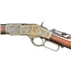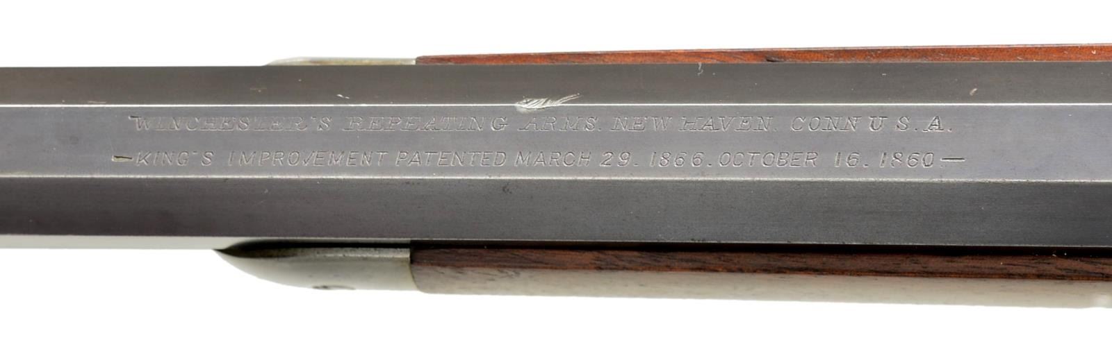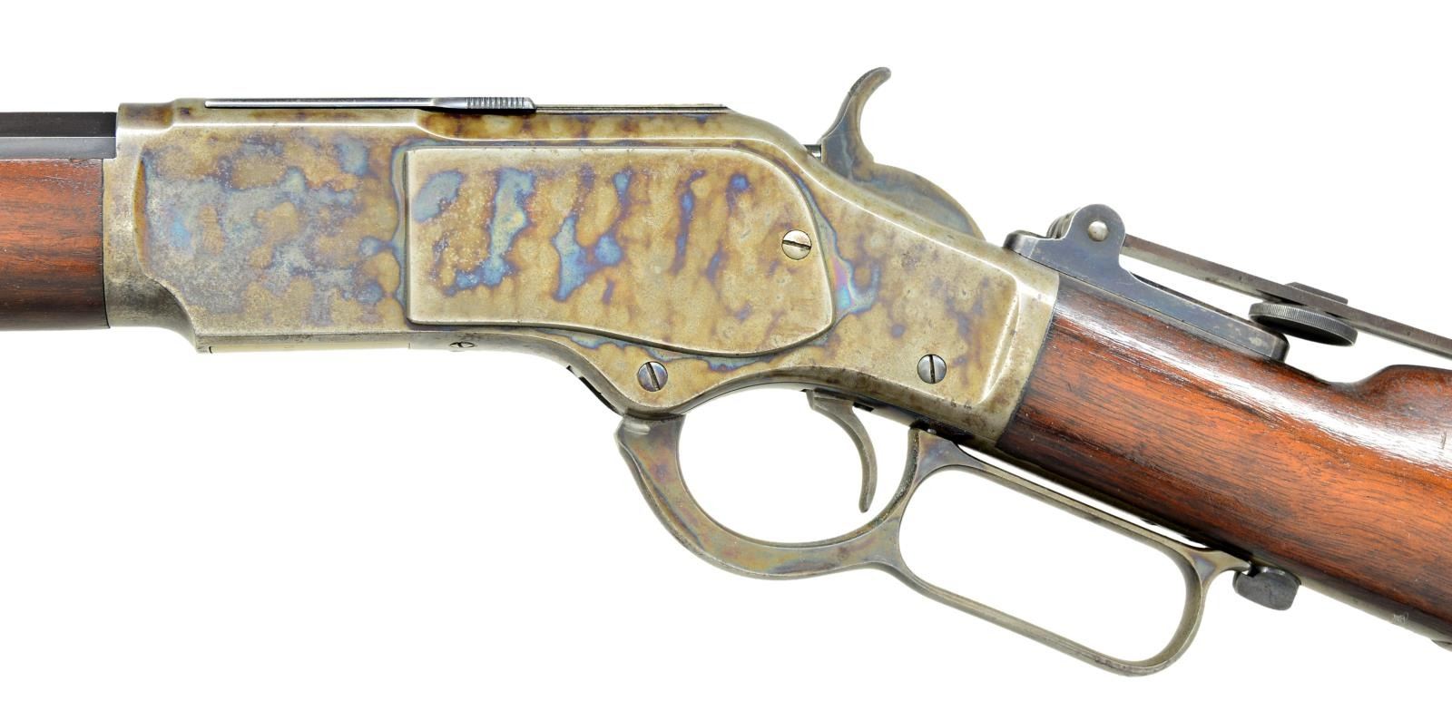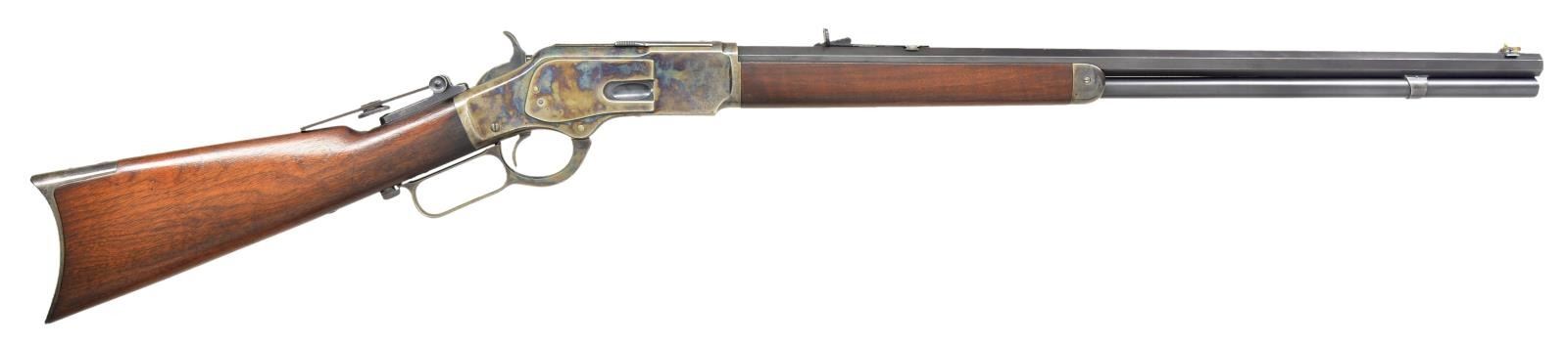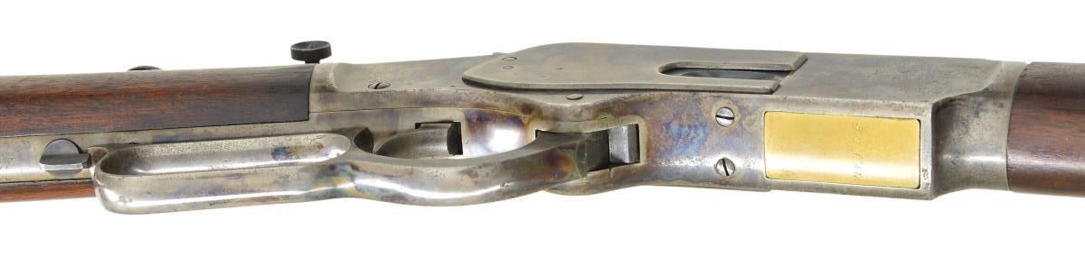 Cal. 38 WCF (38-40). S# 177432B. Bbl. 24" oct. Blue & gold finished combination front sight, elevator adj. sporting rear sight & midrange Vernier tang sight. Full length magazine. Case colored action. Walnut forearm & straight grip stock w/ crescent steel trapdoor buttplate. Mfg. 1885. UNATTACHED ACCESSORIES: 4 piece cleaning rod held in stock compartment. Cody Firearms Records Check stating the following: "Serial number application date not available. / Type: Rifle / Caliber: 38 / Barrel Type; Octagon / Received in warehouse on April 27, 1885 / Shipped from warehouse on May 04 1885, Order number 20518 / Repaired on February 05, 1896 / Shipped from warehouse on February 04, 1896, Order number 5322". CONDITION: bbl. & mag. tube retain 90% lightly faded blue showing edge & Carry wear. Case coloring remains vivid on sides & protected areas blending w/ intermittent dark spotting & carry wear. Buttplate retains traces of case colors w/ balance fading to gray & showing dark spots from light surface corrosion. Original wood finish shows light wear & handling marks w/ an area of age darkening & a hairline crack on left side of wrist. Strong mechanics. Bore is generally bright w/ sound rifling showing scattered light pitting. (01-21190/DS). ANTIQUE. $4,500-6,500.