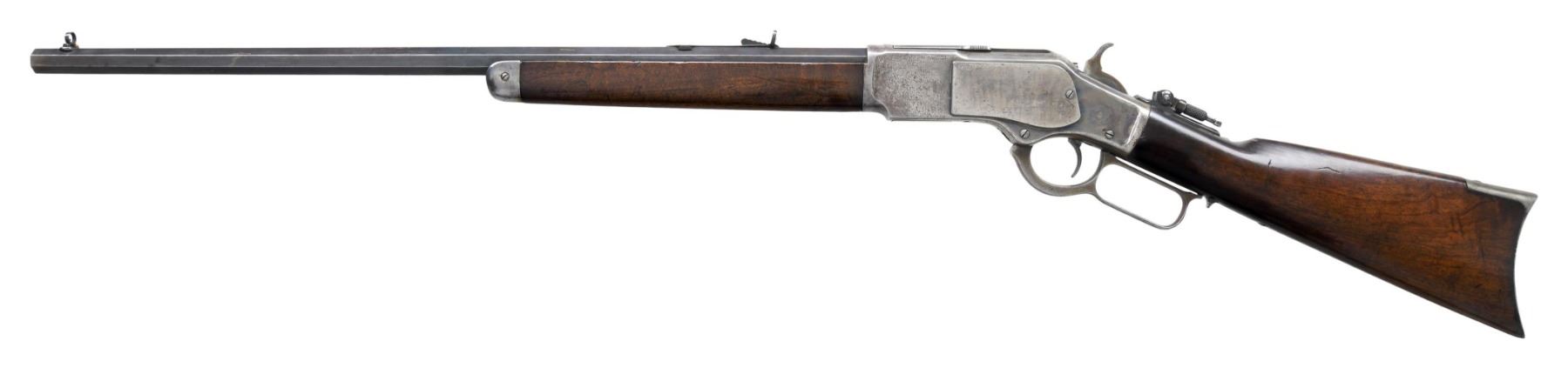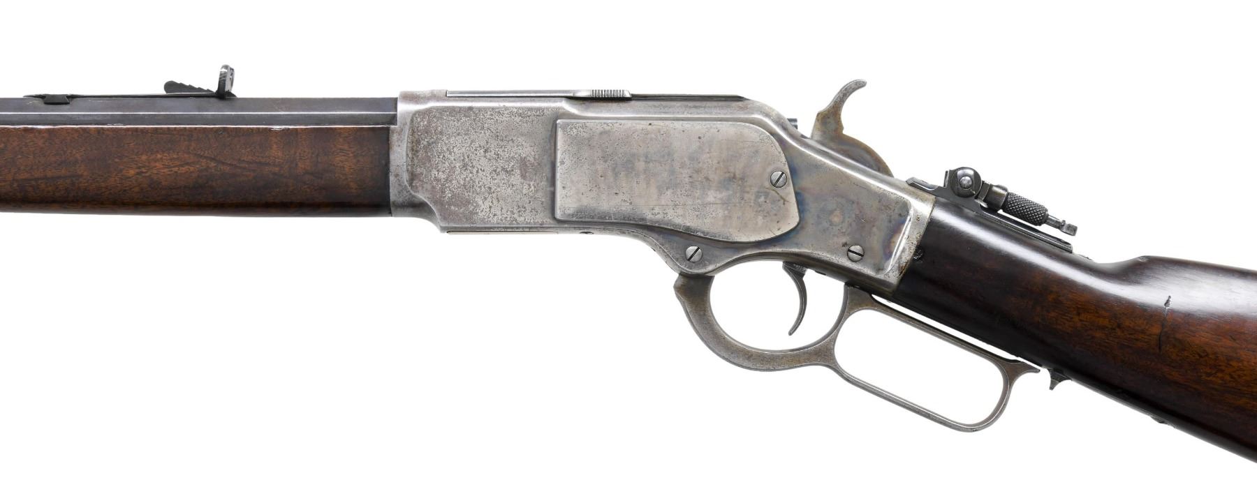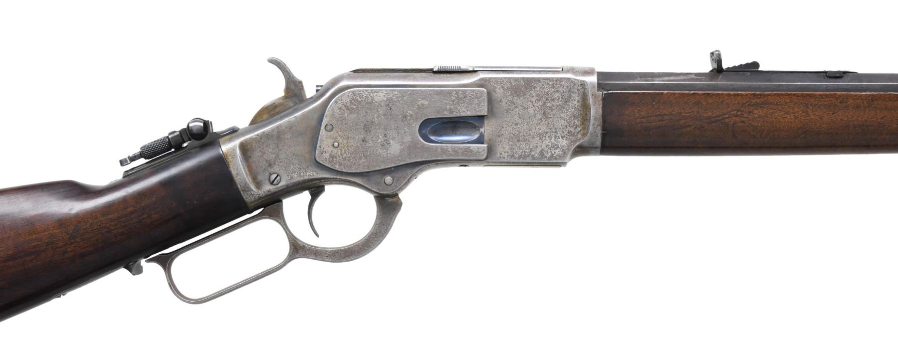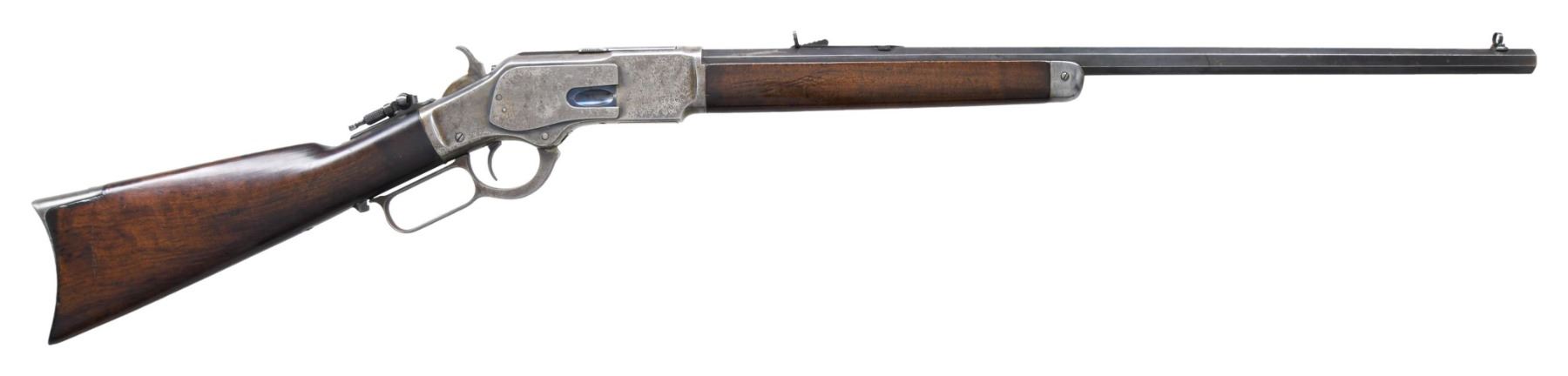 Cal. 32 WCF (32-20). S# 104971A. First year of production for the 32-20 cartridge in this model. Bbl. 24" octagon. Beech's combination front sight, sporting rear sight, and period correct Winchester tang sight. Button mag. Blue finished bbl., with case colored action. Walnut forearm and straight grip stock, with crescent steel buttplate. Mfg. in 1882. CONDITION: bbl. retains 40% original blue, showing edge wear. Action has some remaining case colors on receiver sides and protected areas, with balance fading to gray, showing handling marks and small spots of very light pitting. Loading gate retains strong nitre blue finish. Lightly sanded and refinished wood shows scratches, marks, and dings. Mechanically fine. Bright bore with strong rifling. (01-27084/DS). ANTIQUE. $3,500-5,500