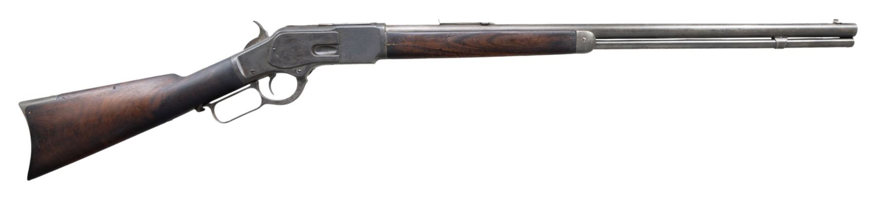 Cal. 32 WCF (32-20). S# 198349B. Bbl. 24" rnd. with replacement bead front sight and replacement flat top sporting rear sight missing elevator. Full length tubular mag. Original finish was blue with case colored hammer and lever. Walnut forearm and stock with crescent steel buttplate. Top of bbl. and left side of action and stock are stamped with the letter "J". Left side of stock also has hand scratched marking that may be initials "I M". Mfg. in 1886. CONDITION: metal finish has faded to gray showing areas of pitting. Sanded and refinished wood has a dark appearance with numerous scratches and dents. Forearm has a full length crack down the right side with a short crack on the left side. Stock has small cracks on left side of wrist and right side of top tang. Toe line has a small hole for a possible sling attachment. Sound action. Dark lightly pitted bore retains worn rifling. (01-27253/DS). ANTIQUE. $1,500-2,000.
