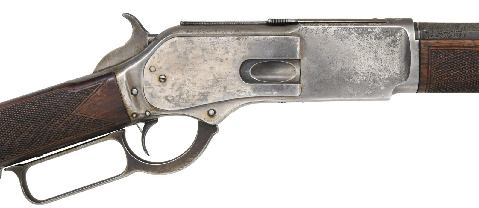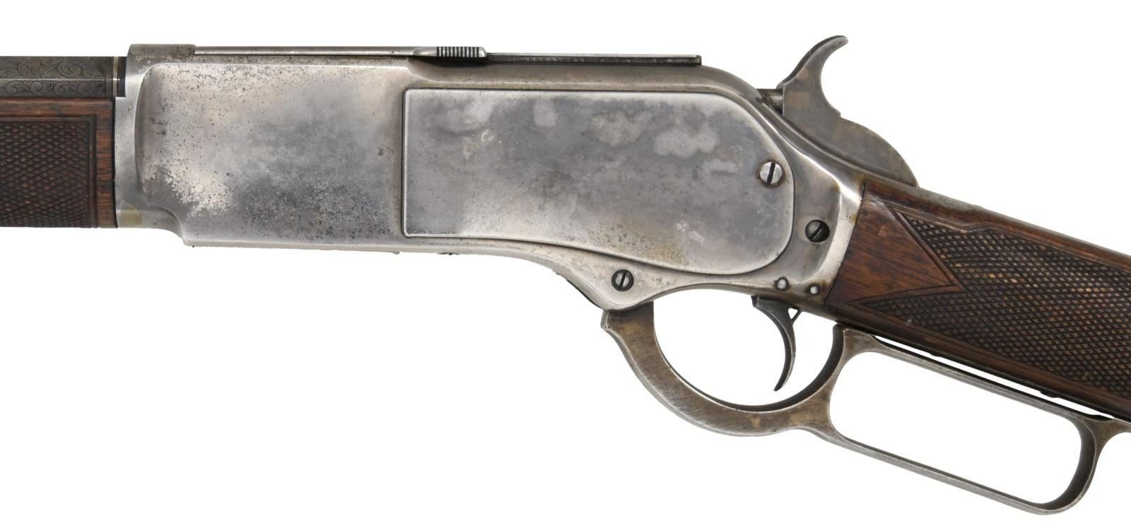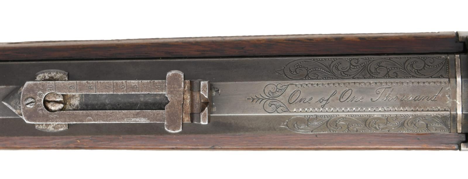 ACTION RIFLE. Cal. 45-60. S# 10034. This rifle is nicely upgraded to the 1 of 1000 specifications & would make a nice display piece in any collection. S# appears to be altered to match an original 1 of 1000 rifle. Top flat at breech end of bbl. is engraved "One of One Thousand". Breech & muzzle ends of bbl. have platinum inlaid bands w/ scroll engraving on the flats. Bbl. 28" octagon w/ German silver blade rocky mountain front sight & folding leaf rear sight. Full length mag. Case colored action. Single set trigger. Walnut forearm & straight grip stock w/ crescent steel trapdoor buttplate. Stock & forearm have coarse added checkering done in the factory style. CONDITION: attractive rifle w/ much original finish. Bbl. & mag. tube retain 70% dull thinning blue w/ touch-up in engraved areas. Action retains 20% lightly visible case colors w/ balance fading to silver/gray. Wood has moderately worn original finish showing scratches, marks & small dents. Sound action w/ functioning set trigger. Dark lightly pitted bore retains intact rifling. (01-24557/DS). ANTIQUE. $12,000-24,000.