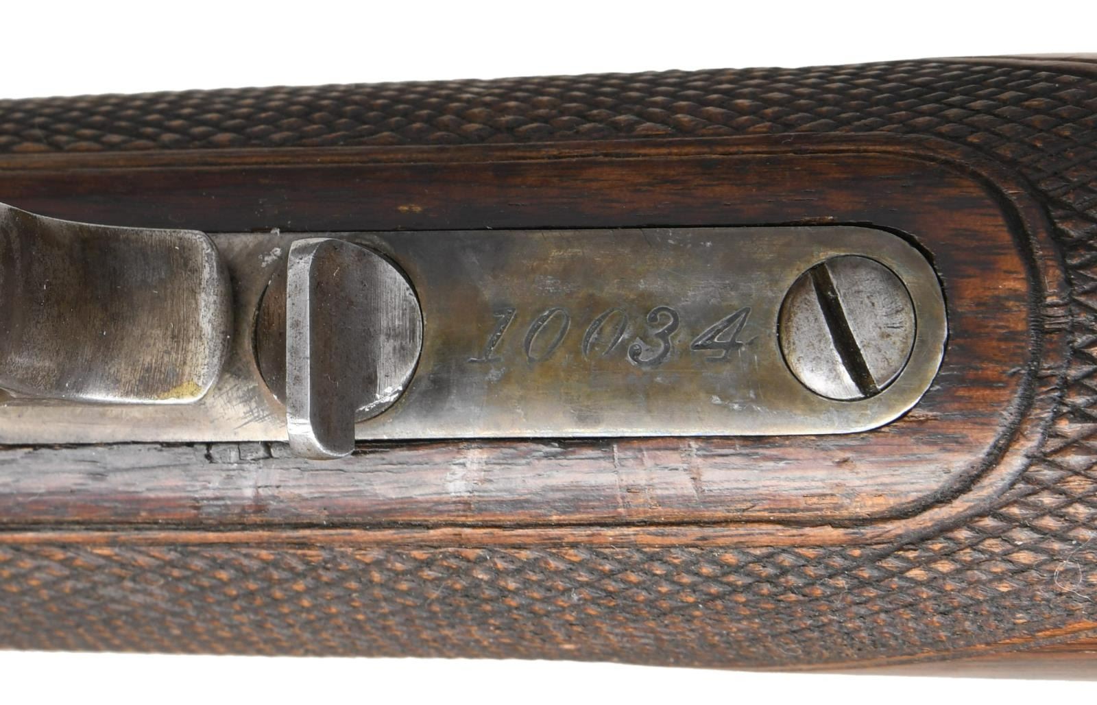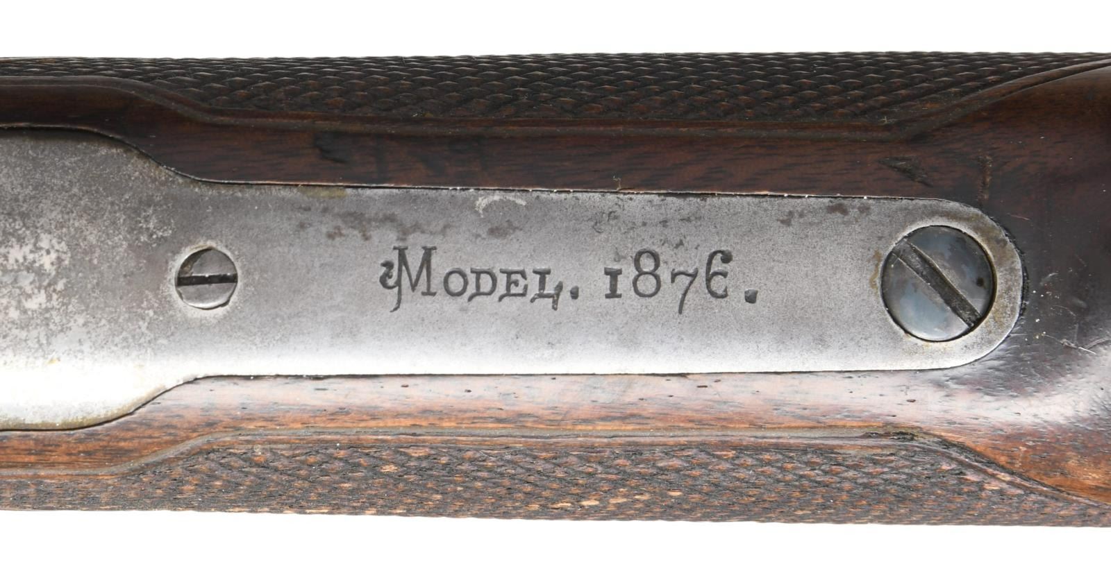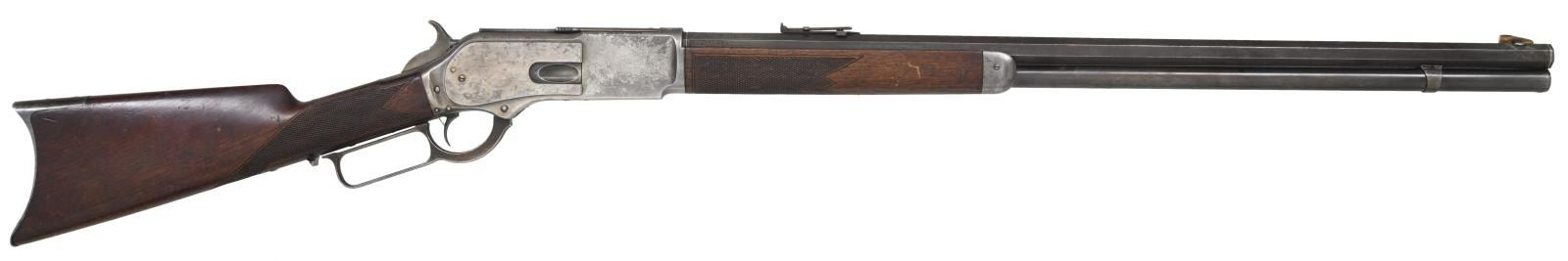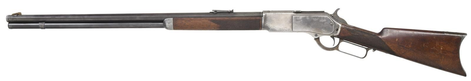 ACTION RIFLE. Cal. 45-60. S# 10034. This rifle is nicely upgraded to the 1 of 1000 specifications & would make a nice display piece in any collection. S# appears to be altered to match an original 1 of 1000 rifle. Top flat at breech end of bbl. is engraved "One of One Thousand". Breech & muzzle ends of bbl. have platinum inlaid bands w/ scroll engraving on the flats. Bbl. 28" octagon w/ German silver blade rocky mountain front sight & folding leaf rear sight. Full length mag. Case colored action. Single set trigger. Walnut forearm & straight grip stock w/ crescent steel trapdoor buttplate. Stock & forearm have coarse added checkering done in the factory style. CONDITION: attractive rifle w/ much original finish. Bbl. & mag. tube retain 70% dull thinning blue w/ touch-up in engraved areas. Action retains 20% lightly visible case colors w/ balance fading to silver/gray. Wood has moderately worn original finish showing scratches, marks & small dents. Sound action w/ functioning set trigger. Dark lightly pitted bore retains intact rifling. (01-24557/DS). ANTIQUE. $12,000-24,000.