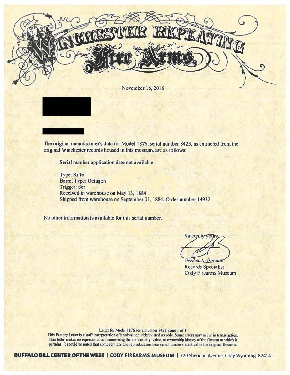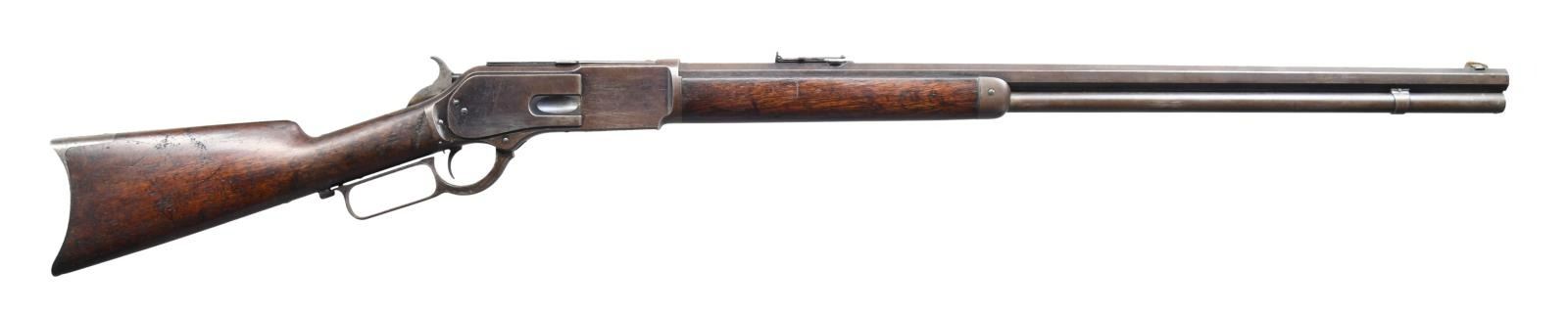 Cal. 45-75. S# 8423. Bbl. 28", octagon. Brass blade, rocky mountain front sight. Graduated leaf rear sight. Full-length mag. Action features a thumbprint dust cover and a single-set trigger. Walnut forearm and straight grip stock with crescent steel trapdoor buttplate. UNATTACHED ACCESSORIES: Cody Firearms Museum letter confirming configuration. Received in the warehouse on May 13th, 1884. Shipped from the warehouse on September 1st, 1884. Order no. 14932. CONDITION: 20% dull blue, fading to brown. Hammer has traces of case colors. The original wood finish shows wear and a darkened appearance with numerous scratches and marks. having a deep gouge on the right side of the wrist. The trigger will not hold in its set position. Bore has a slightly darkened appearance, retaining sound rifling. (01-24431/DS). ANTIQUE. $3,000-4,000.