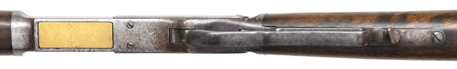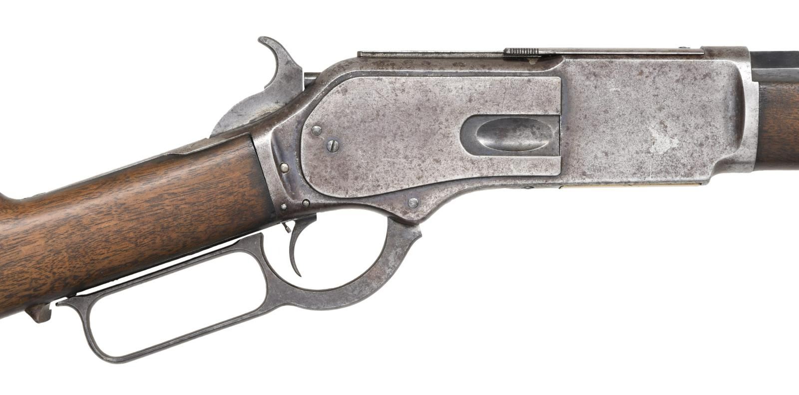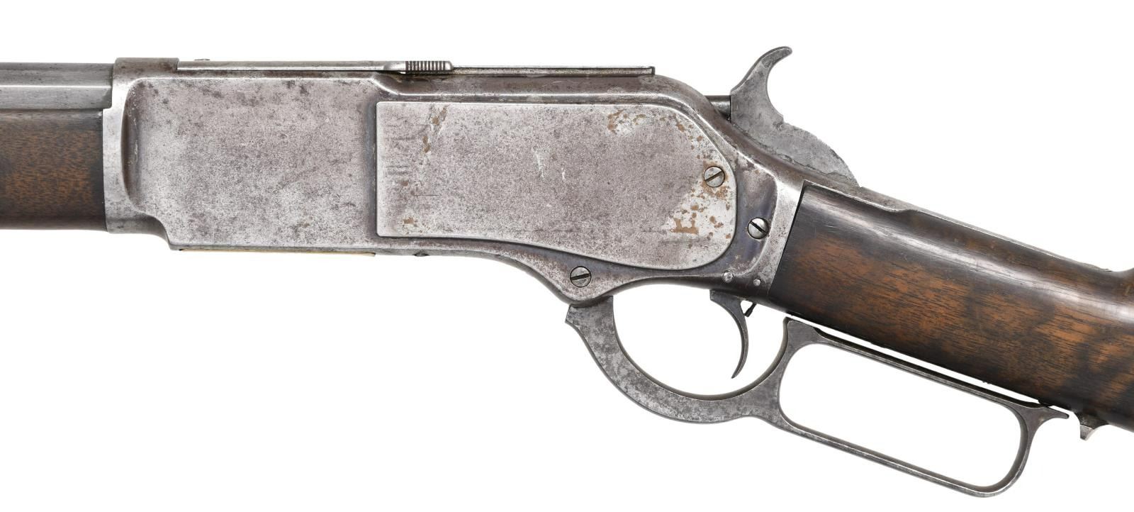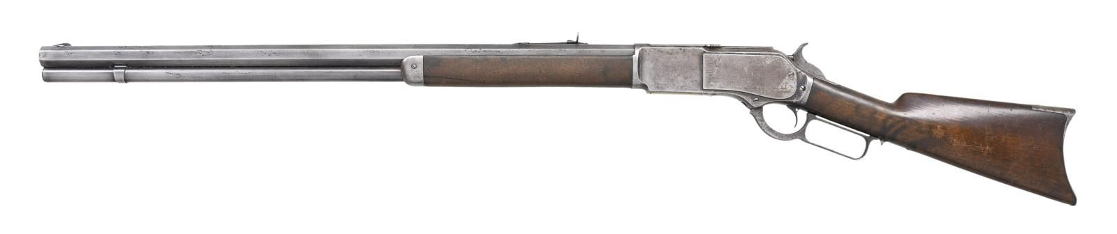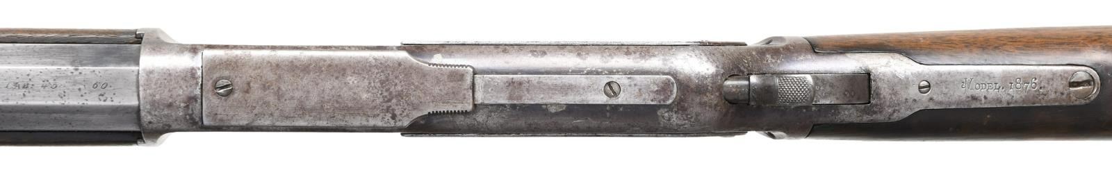 Cal. 45-60. S# 17361. Bbl. 28" extra heavy measuring 1" across flats at muzzle. The Winchester book by George Madis states that 1 of every 1,000 model 1876 rifles had heavier than standard bbls. Rocky mountain front sight w/ sporting rear sight. Full length mag. Action features a special order single set trigger. Walnut forearm & straight grip stock w/ crescent steel trapdoor buttplate. Mfg. 1881. CONDITION: metal has faded to gray brown showing areas of cleaning on bbl. & mag. tube. Unsanded wood shows wear w/ scattered scratches & marks. Sound action w/ functioning trigger. Good bore retains sound rifling. (01-24286/DS). ANTIQUE. $4,000-6,000.