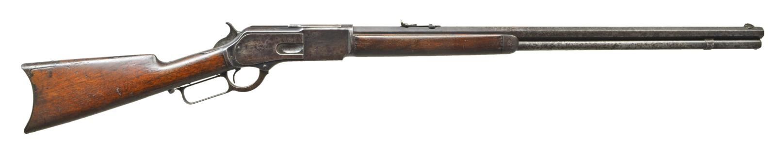 Cal. 40-60 WCF. s# 62798. Bbl. 28" octagon. German silver blade front sight & folding leaf elevator adj. sporting rear sight. Full length mag. Walnut forearm & straight grip stock w/ crescent steel trap door butt plate. Mfg. 1888. CONDITION: Gray/brown metal is mottled w/ dark spotting. Stock has worn appearance showing scratches, dents & grain checks. Age darkened forearm appears to be and old replacement. Bore retains lightly worn rifling showing scattered pitting. Sound mechanics. (01-20190/DS). ANTIQUE. $2500-3500.