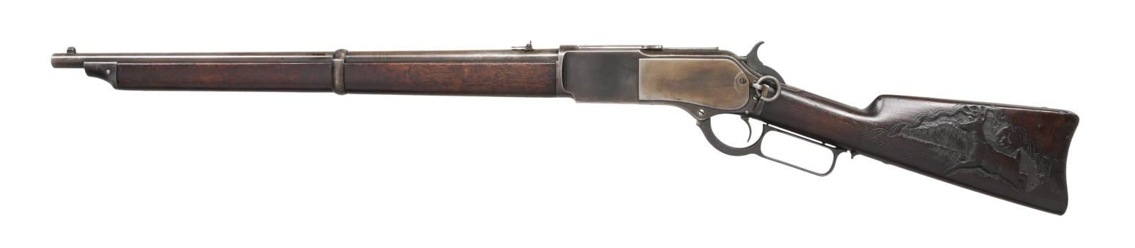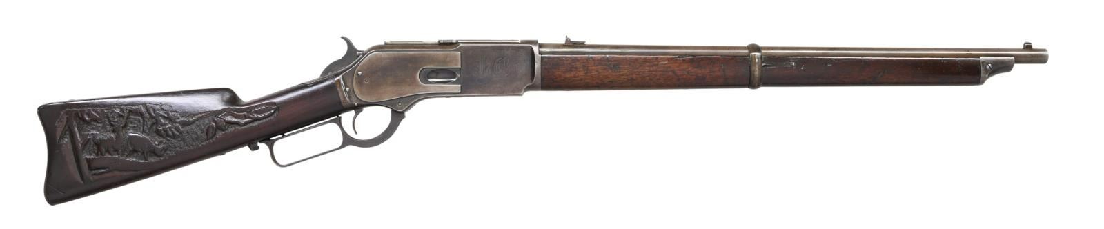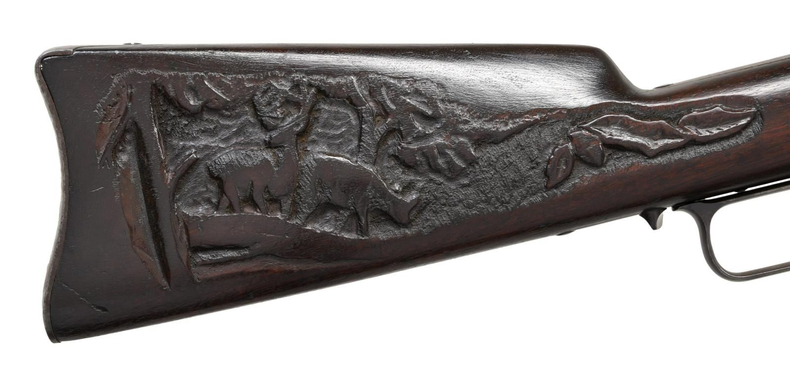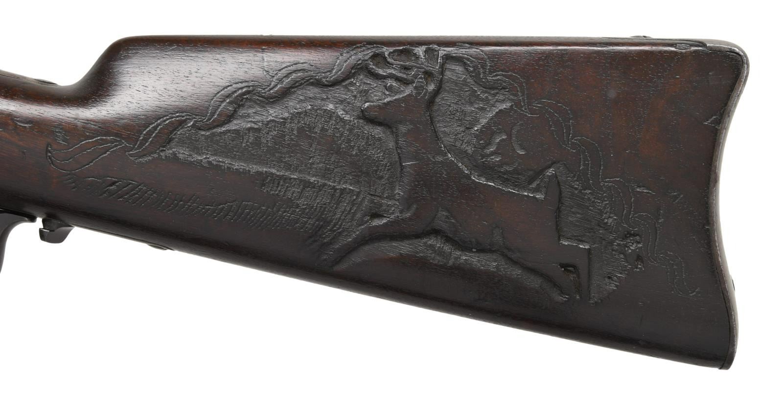 Cal. 45-60. S# 28227. Bbl. 22" round. Barleycorn front sight w/ folding leaf rear sight. Action has saddle ring on right side. Right side of frame is engraved w/ initials "RC". Full length band fastened forearm w/ steel nose cap. Straight grip walnut stock w/ steel carbine buttplate. Right side of stock has hand carved woodland scene w/ buck & doe deer. Left side of stock has hand-carved scene w/ running whitetail buck. Mfg. 1882. CONDITION: bbl. finish has faded to a light brown gray patina. Action has some blue in protected areas fading to gray brown. Wood shows dents, scratches & marks. Extractor is broken. Lightly pitted bore w/ worn rifling. (01-24831/DS). ANTIQUE. $5,000-7,500.