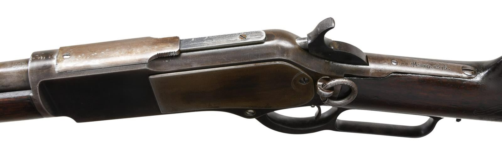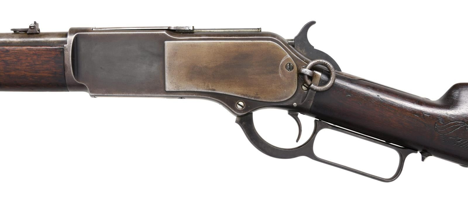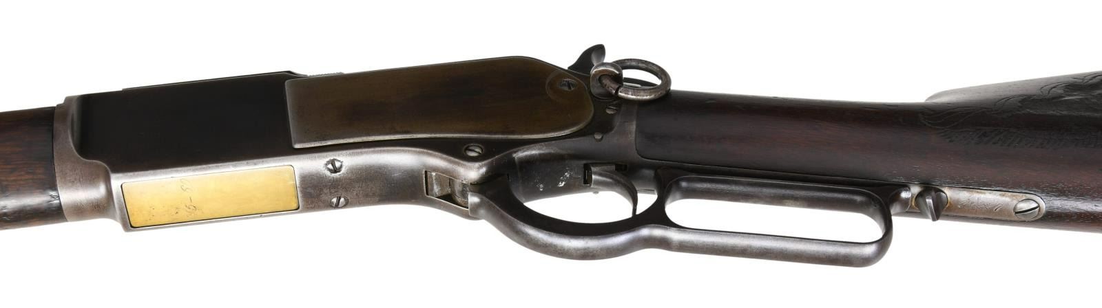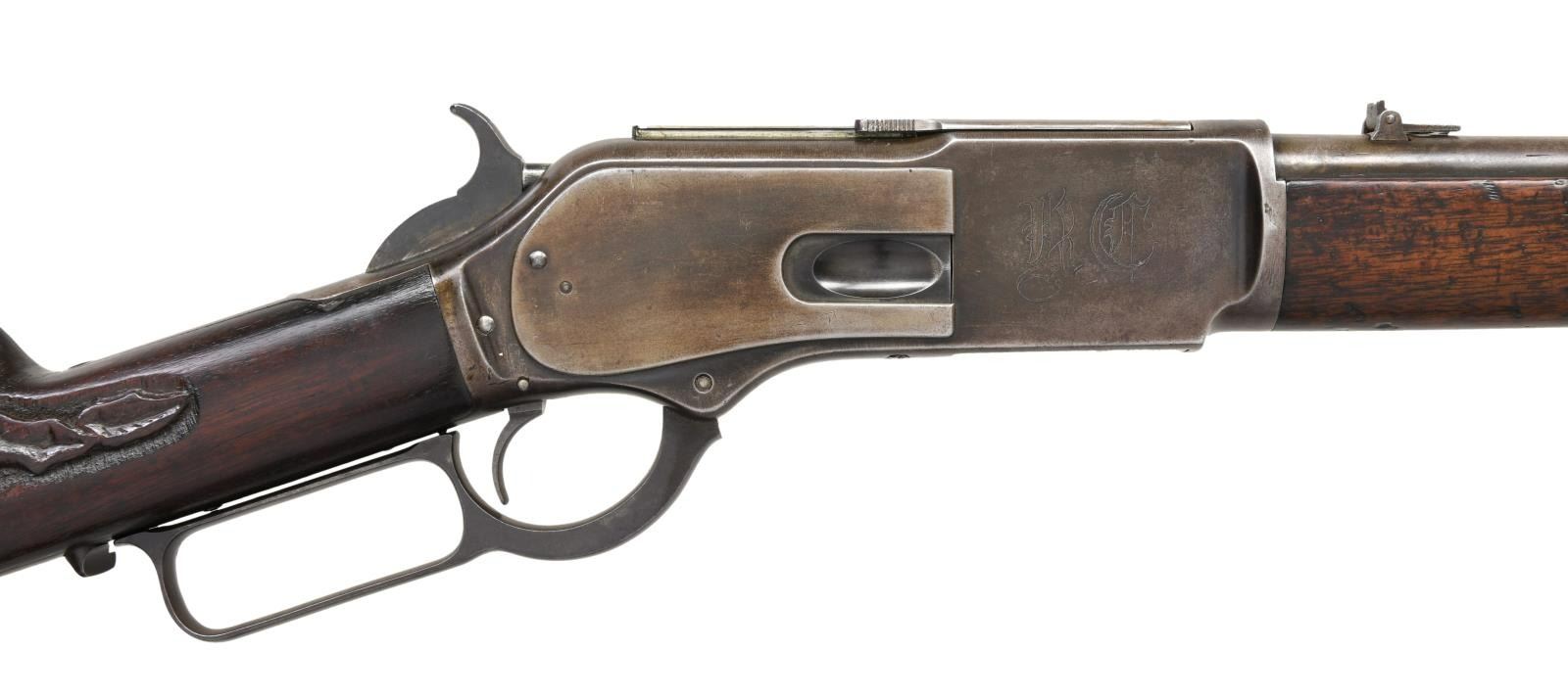 Cal. 45-60. S# 28227. Bbl. 22" round. Barleycorn front sight w/ folding leaf rear sight. Action has saddle ring on right side. Right side of frame is engraved w/ initials "RC". Full length band fastened forearm w/ steel nose cap. Straight grip walnut stock w/ steel carbine buttplate. Right side of stock has hand carved woodland scene w/ buck & doe deer. Left side of stock has hand-carved scene w/ running whitetail buck. Mfg. 1882. CONDITION: bbl. finish has faded to a light brown gray patina. Action has some blue in protected areas fading to gray brown. Wood shows dents, scratches & marks. Extractor is broken. Lightly pitted bore w/ worn rifling. (01-24831/DS). ANTIQUE. $5,000-7,500.