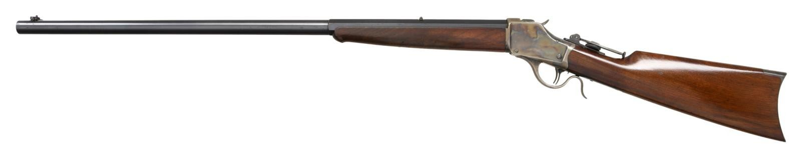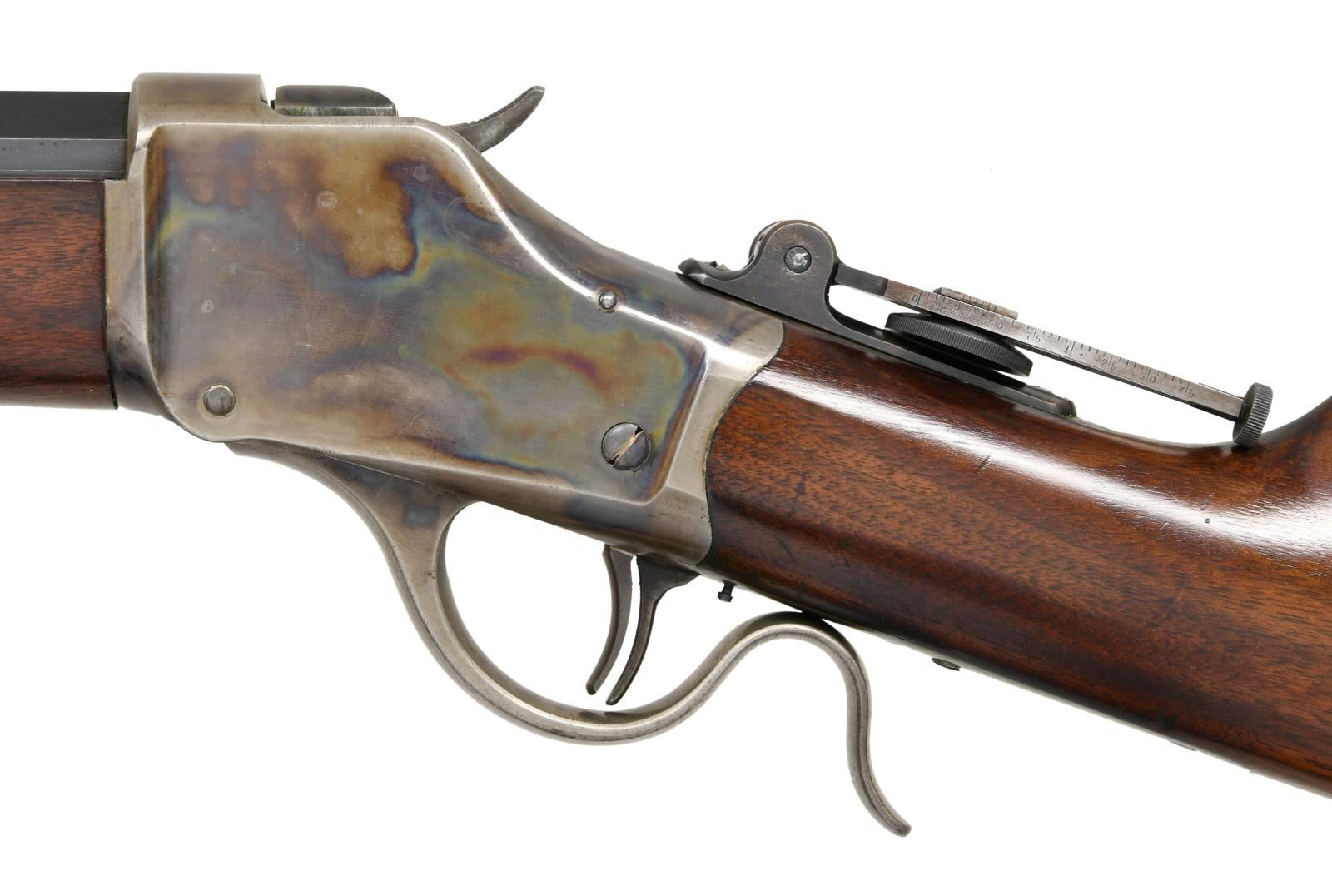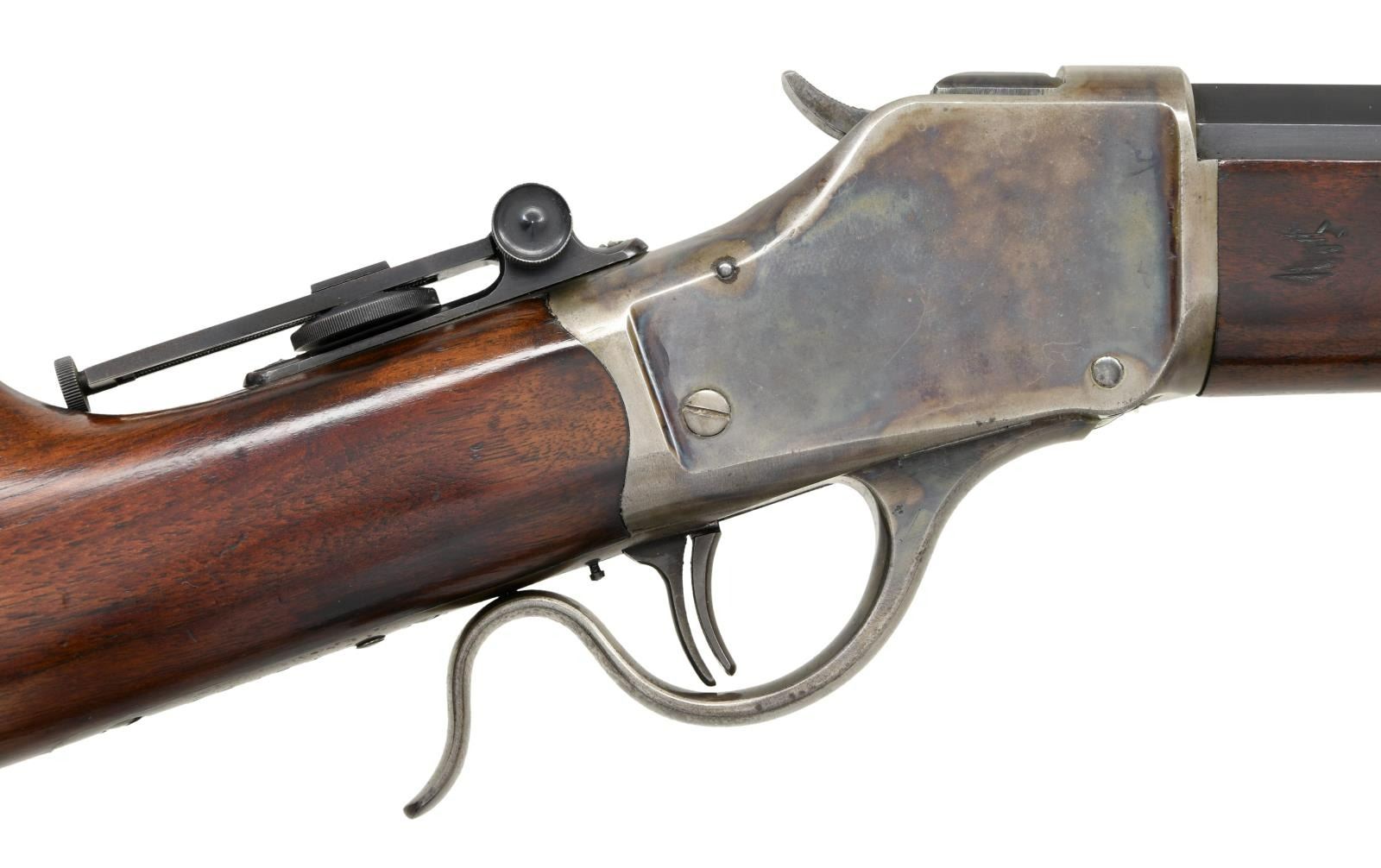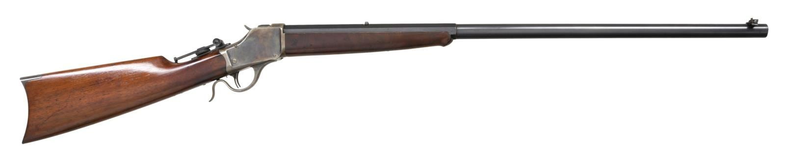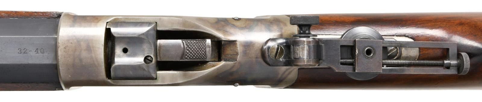 RIFLE. Cal. 32-40. S# 72729. Bbl. No. 3 weight 30" octagon to round. Wind gauge combination front sight, spirit level in rear dovetail w/ mid range Vernier tang sight. Action features close coupled double set triggers. Blue finished bbl. w/ case colored action. Ebony tipped schnable forearm & straight grip walnut stock w/ crescent steel buttplate. Mfg. 1895. CONDITION: bbl. retains over 90% original blue showing slight edge wear & small marks. Action retains 80% lightly faded case colors. Original wood finish show numerous light scratches & marks. Sound action w/ functioning triggers. Bright bore has lightly worn rifling. PROVENANCE STATEMENT: From the Harold Prucha Collection". (01-23270/DS). ANTIQUE. $2500-4500.
