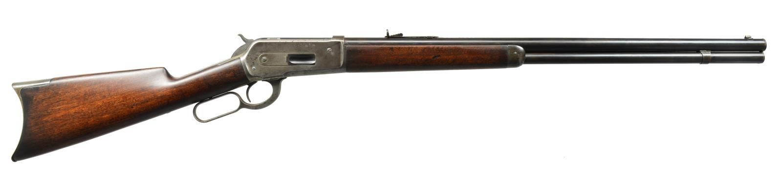 Cal. 40-65. S# 14041. Bbl. 26" rnd. w/ sporting sights. Full length mag. Case colored action. Walnut forearm & straight grip stock w/ crescent steel buttplate. 1887 Mfg. CONDITION: Bbl. & mag. tube retain 80% dull lightly faded blue. Action finish is fading to silver/gray showing spots of very light remaining case colors. Gently resanded & refinished wood. Bore has frosted appearance w/ worn rifling showing spots of pitting. (01-17870). ANTIQUE. $3,500-5,000.