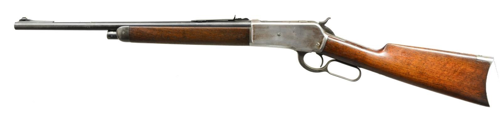 Cal. 33 WCF. S# 151060A. Bbl. rnd., shortened to 19 1/2". Replacement ramp mounted gold bead front sight w/ replacement elevator adj. sporting rear sight. Mag. tube shortened to half length. Walnut forearm & straight grip stock w/ crescent steel buttplate. 1911 Mfg. CONDITION: bbl. retains 60% dull lightly faded blue showing sm. dents & spots of corrosion. Action has cleaned gray appearance showing scratches, marks & sm. spots of pitting. Sanded & refinished wood shows dents & handling marks. Bore is bright w/ sharp rifling. (20-2315/DS). CURIO. $650-1,000.