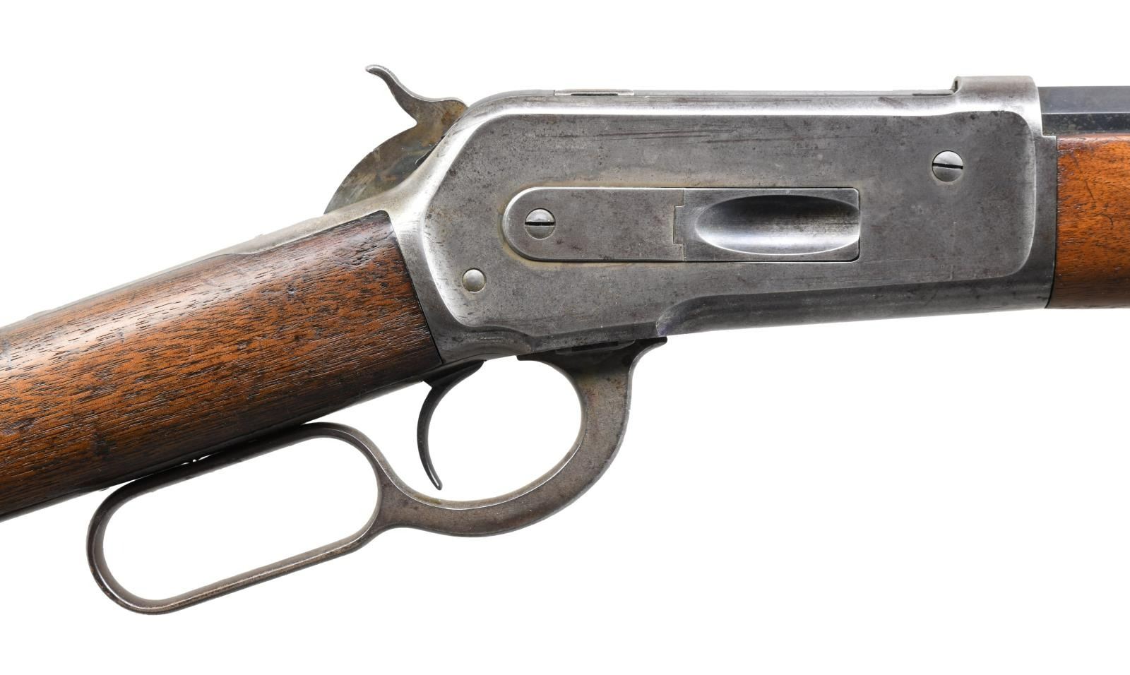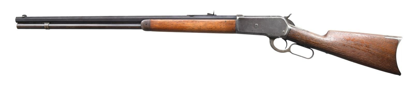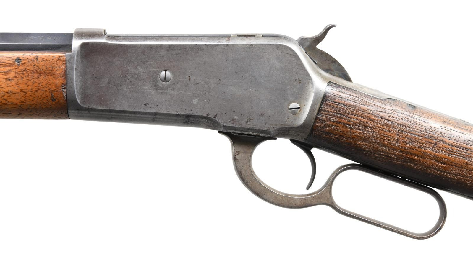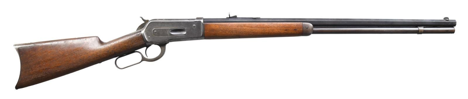 Cal. 45-90. S# 30970. Bbl. 26" octagon w/ sporting rear sight & Lyman no. 4 hunting rear sight. Full length mag. Blue finish w/ case colored action. Bbl. & receiver have WP proof marks. Walnut forearm & straight grip stock w/ crescent steel buttplate. Mfg. 1889. CONDITION: bbl. & mag. tube retain 70% lightly faded blue. Action has faded to a silvery gray w/ traces of case colors on the hammer. Forearm has worn finish showing scratches & marks. Stock has heavily weathered rough appearance. Bore retains sound rifling showing sm. spots of light pitting. (01-24472/DS). ANTIQUE. $1,500-2,500.