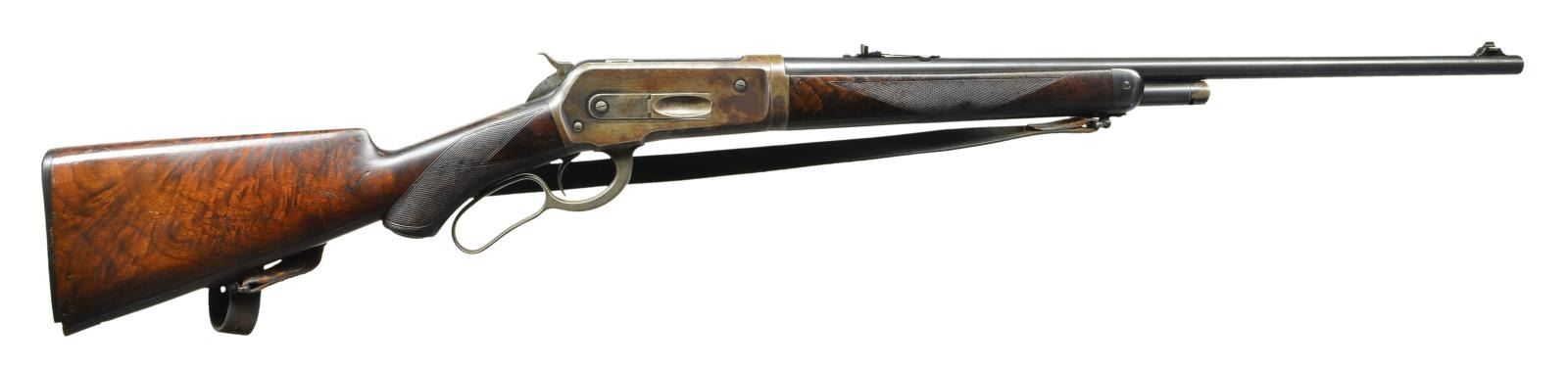 ACTION RIFLE. Cal. 33 WCF. S# 126434. Bbl. 24" tapered round takedown style. Replacement sights include a Lyman bead front & Marbles elevator adj. rear. Blue finish with case colored hammer & lever. Forend & deluxe pistol grip stock of XXX fancy walnut. Features include style "H" checkering, small hard rubber cap & hard rubber shotgun buttplate. Right inside lower tang is marked with assembly number 385 followed by wood grade marking XXX. Top stock channel has matching 385. Leather sling is attached by aftermarket swivels on screw attached bases on toe line of stock & forend cap. MFG. 1902. CONDITION: Bbl. retains 70% dull faded blue. Action has gray/brown appearance blending with areas of corrosion. Hammer & lever retain traces of case colors. Wood has an age darkened appearance with worn checkering, scratches marks & dents. Toe of stock has an added wood repair & chip, buttplate has a corresponding break at toe. Dark bore retains sharp rifling. (22-2879/DS). CURIO. $2000-2750.