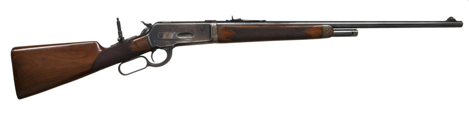 RIFLE. Cal. 33 WCF. S# 159467A. Bbl. 24" tapered round of takedown style. Lyman no. 4 hunting front sight w/ Marble semi buckhorn sporting rear sight & combination tang sight. 1-2 half length mag. Blue finish. Walnut forearm & straight grip stock w/ hard rubber shotgun butt have custom hand checkering. Very late rifle, production ended at S# 159994 in 1935. CONDITION: bbl. retains 90% blue showing small scratches & spotting. Action & fittings retain over 50% blue blending w/ areas of flaking. Refinished wood shows numerous scratches, marks & dents. Mechanics are fine. Bore retains lightly worn rifling. (23-2152/DS). CURIO. $2,000-3,000.