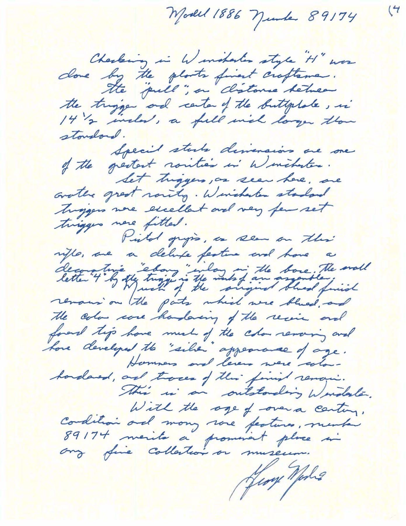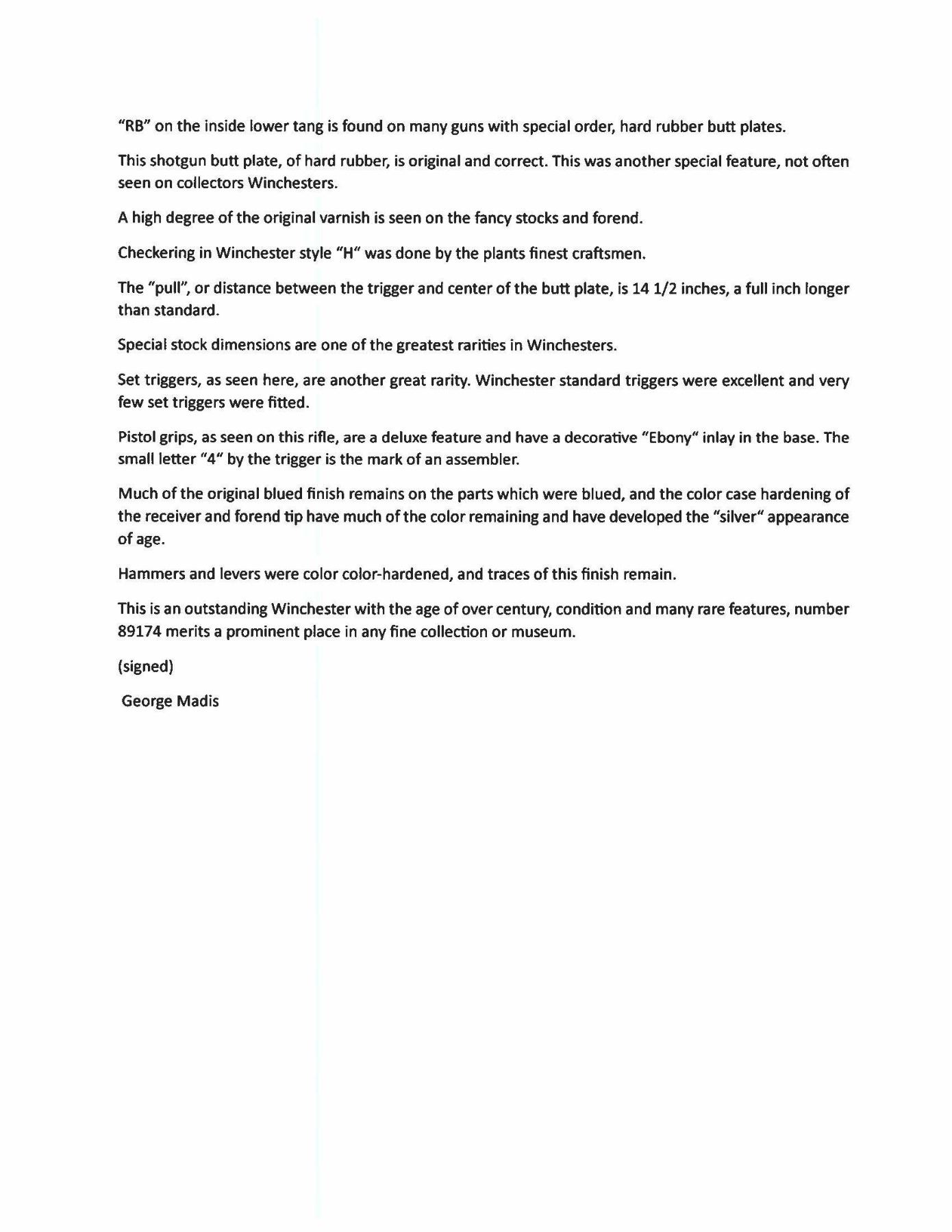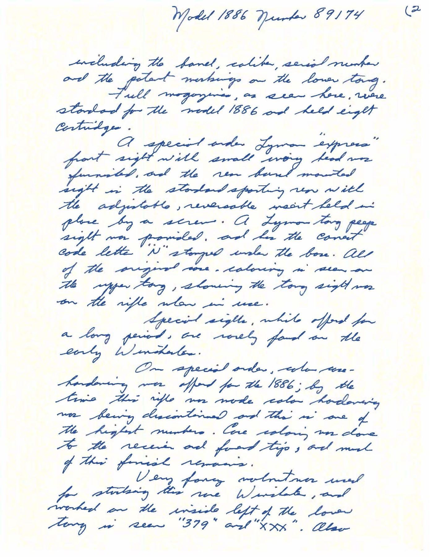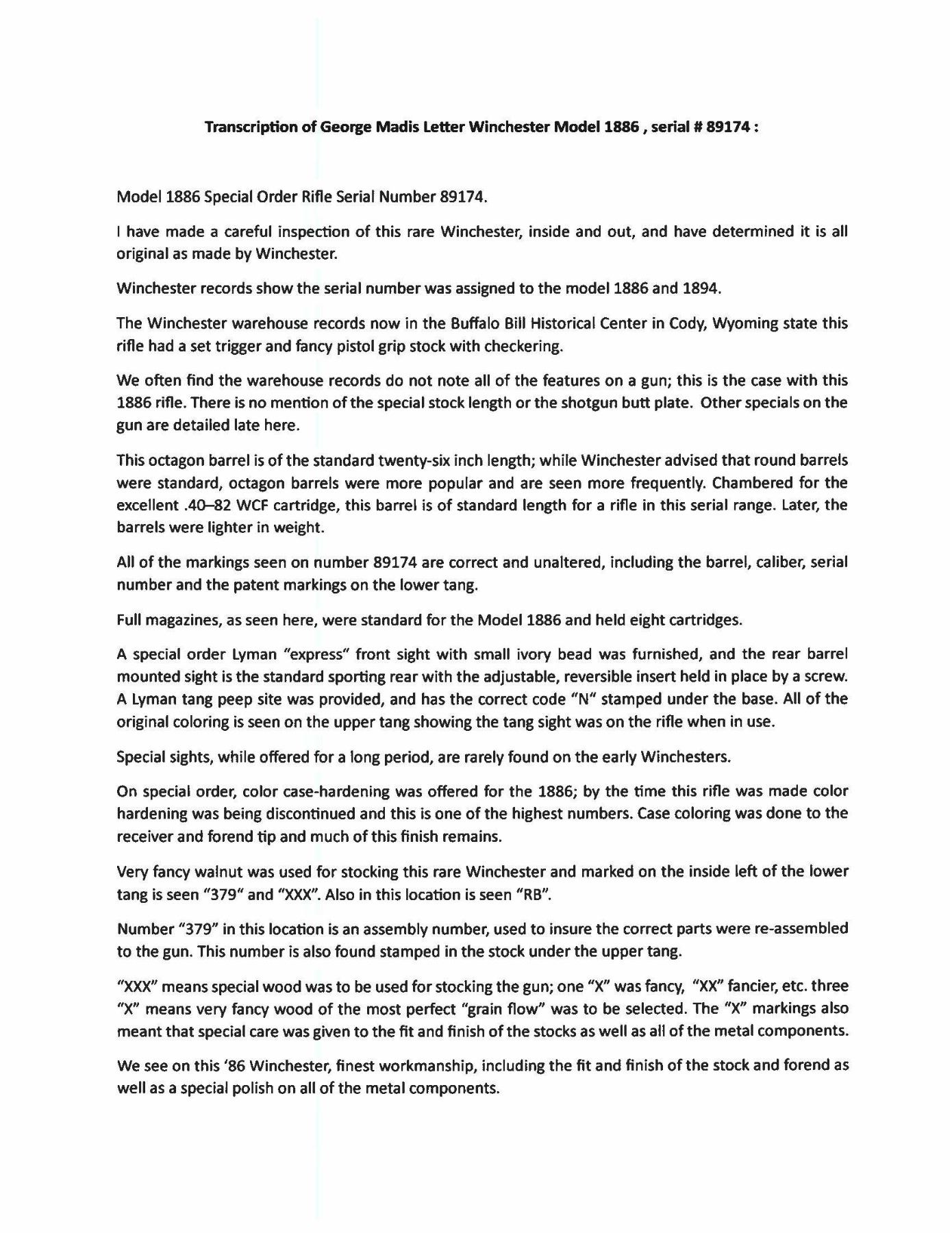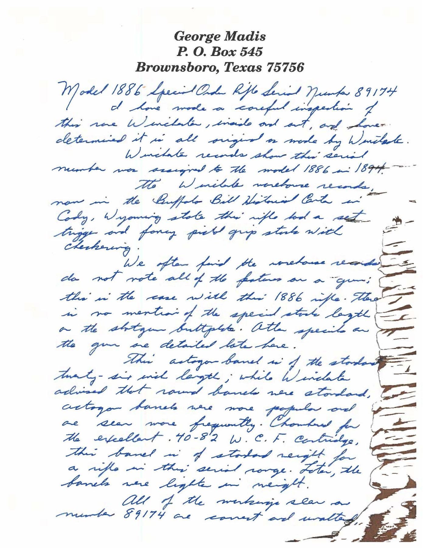 RIFLE WITH VERY RARE EXTRA LENGTH STOCK & MADIS LETTER. Cal. 40-82 WCF. S#. 89174. Bbl. 26" octagon. As noted in accompanying letter from George Madis, special order stock dimensions are very rarely found on Winchester rifles. Lyman Express bead front, standard sporting rear w/ a Lyman tang peep sight having the correct code "N" stamped under the base. Full length mag. Blue finish w/ case colored action & forend cap. Single set trigger. Forend & pistol grip stock of XXX fancy black walnut. Features include style "H" factory checkering, ebony grip insert & hard rubber shotgun buttplate. The special order stock has an LOP of 14 1/2", one inch longer than standard. Special order stock dimensions are very rarely found on Winchester rifles. Left inside of lower tang is marked with assembly # "379" followed by "XXX" wood grade marking & "RB" for rubber buttplate. A matching "379" is found in the top tang channel. UNATTACHED ACCESORIES: a George Madis hand written letter discussing the rare special features and originality of the rifle. Cody Firearms Records check stating: Type: Rifle / Caliber: 40/82 / Barrel type: Octagon / Trigger: Set / Checkered stock, Pistol grip / Received in warehouse on June 15, 1894 / Shipped from warehouse on June 15, 1894, Order number 13986." CONDITION: overall a very attractive original special order 1886 rifle. Bbl. & mag tube retain over 80% lightly faded original blue. Action shows 40%+ lightly faded factory case colors with scattered peppery oxidation appearing at bottom. Original wood finish is very good, showing some wear spots, scattered scratches & marks. Right side of forend has a short tight grain crack from the highly figured wood approx 1/4" in length. Base of front sight is slightly marred from attempt at drifting. Sound action & set trigger. Bore has a slightly frosted appearance retaining strong rifling. (01-25862/DS). ANTIQUE. $8,500-12,500.
