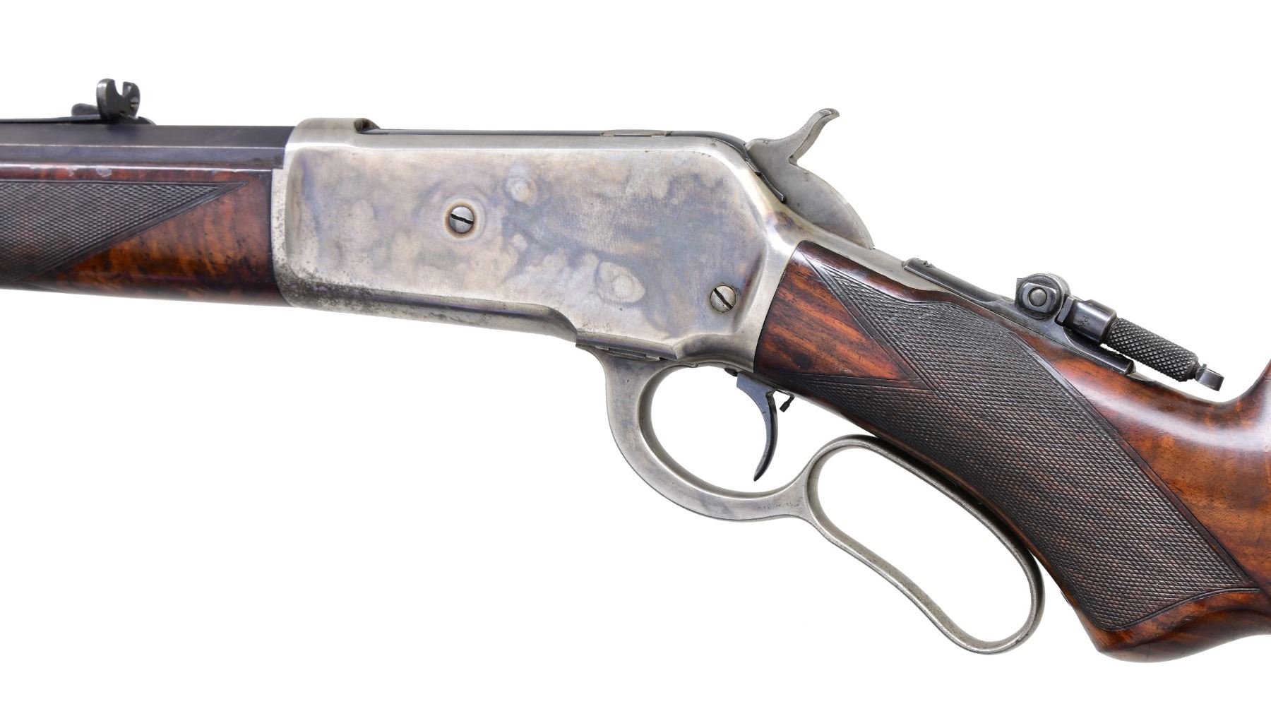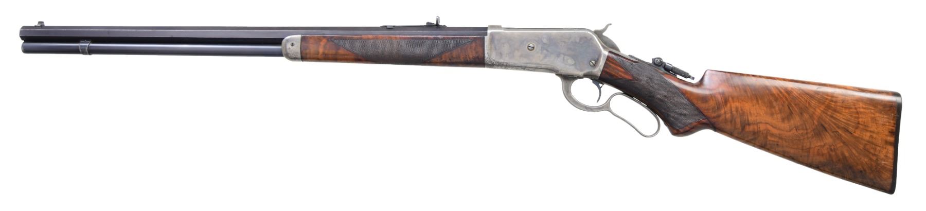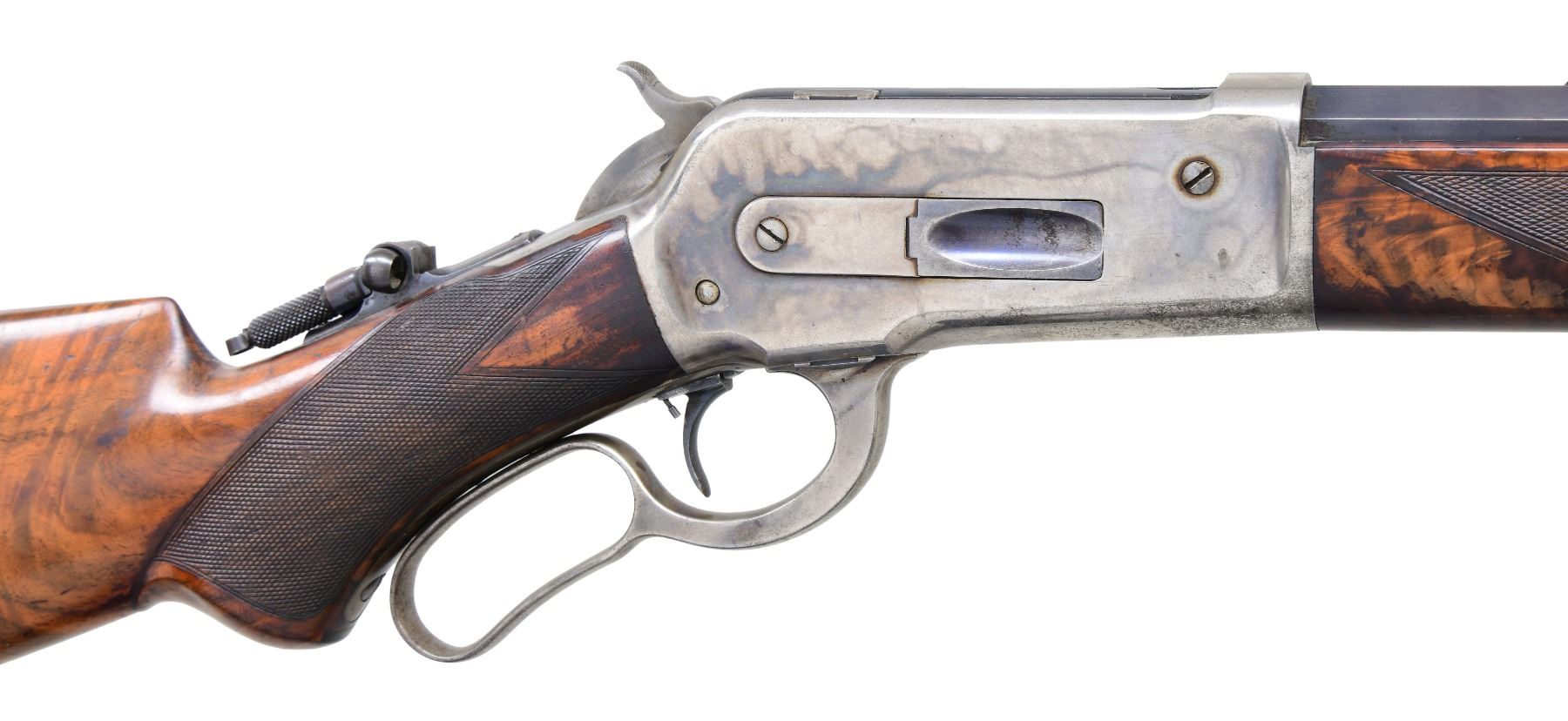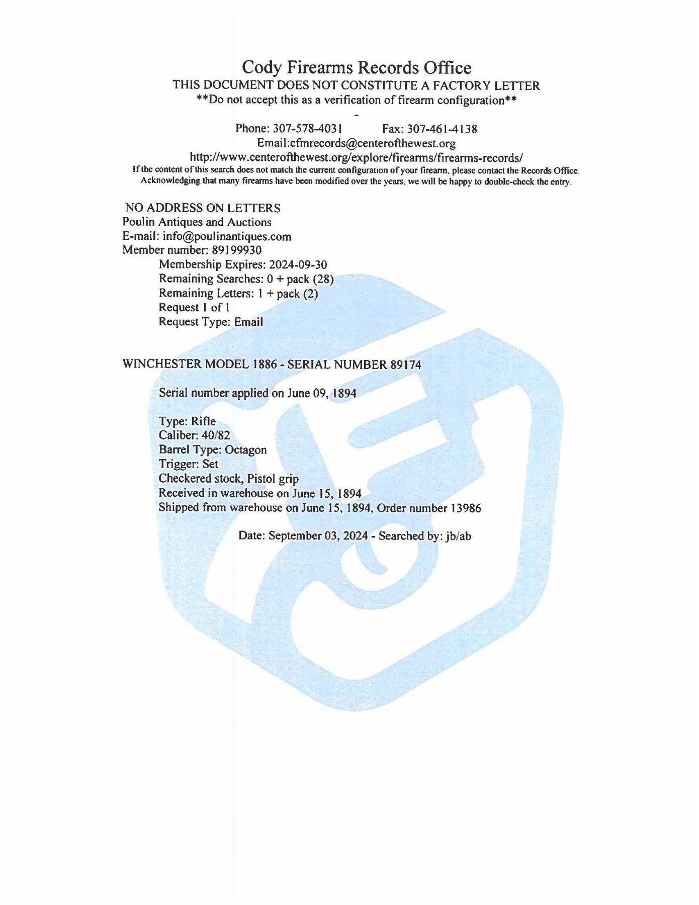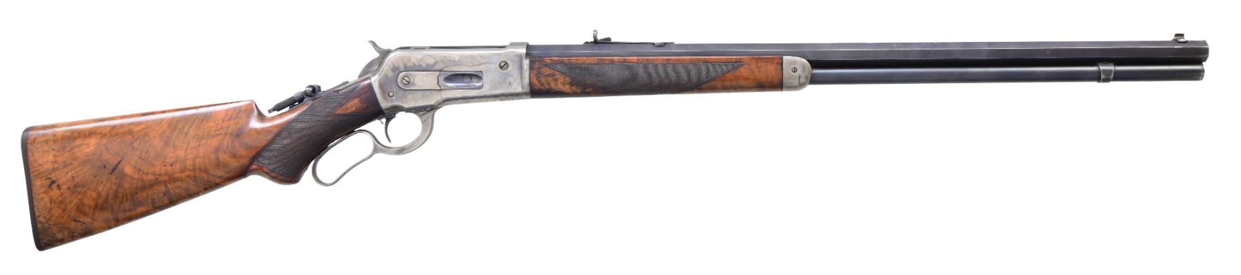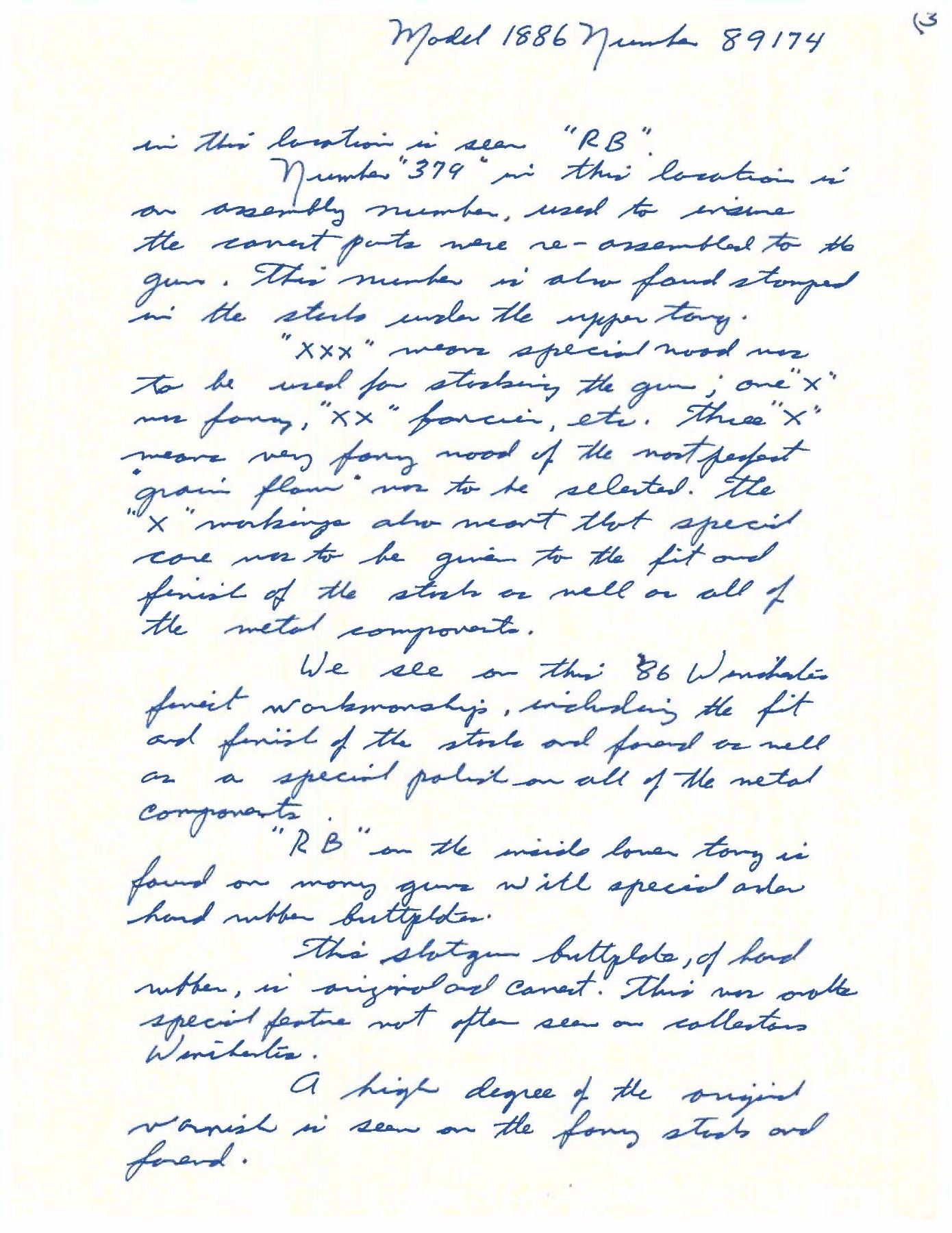 RIFLE WITH VERY RARE EXTRA LENGTH STOCK & MADIS LETTER. Cal. 40-82 WCF. S#. 89174. Bbl. 26" octagon. As noted in accompanying letter from George Madis, special order stock dimensions are very rarely found on Winchester rifles. Lyman Express bead front, standard sporting rear w/ a Lyman tang peep sight having the correct code "N" stamped under the base. Full length mag. Blue finish w/ case colored action & forend cap. Single set trigger. Forend & pistol grip stock of XXX fancy black walnut. Features include style "H" factory checkering, ebony grip insert & hard rubber shotgun buttplate. The special order stock has an LOP of 14 1/2", one inch longer than standard. Special order stock dimensions are very rarely found on Winchester rifles. Left inside of lower tang is marked with assembly # "379" followed by "XXX" wood grade marking & "RB" for rubber buttplate. A matching "379" is found in the top tang channel. UNATTACHED ACCESORIES: a George Madis hand written letter discussing the rare special features and originality of the rifle. Cody Firearms Records check stating: Type: Rifle / Caliber: 40/82 / Barrel type: Octagon / Trigger: Set / Checkered stock, Pistol grip / Received in warehouse on June 15, 1894 / Shipped from warehouse on June 15, 1894, Order number 13986." CONDITION: overall a very attractive original special order 1886 rifle. Bbl. & mag tube retain over 80% lightly faded original blue. Action shows 40%+ lightly faded factory case colors with scattered peppery oxidation appearing at bottom. Original wood finish is very good, showing some wear spots, scattered scratches & marks. Right side of forend has a short tight grain crack from the highly figured wood approx 1/4" in length. Base of front sight is slightly marred from attempt at drifting. Sound action & set trigger. Bore has a slightly frosted appearance retaining strong rifling. (01-25862/DS). ANTIQUE. $8,500-12,500.