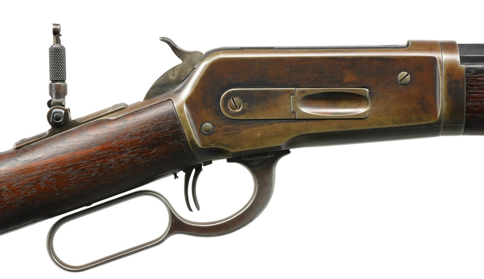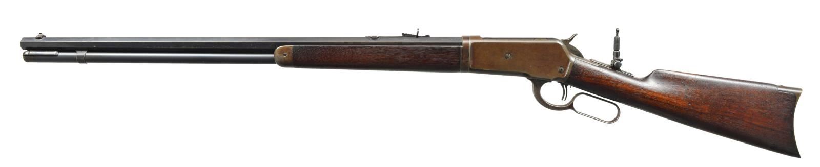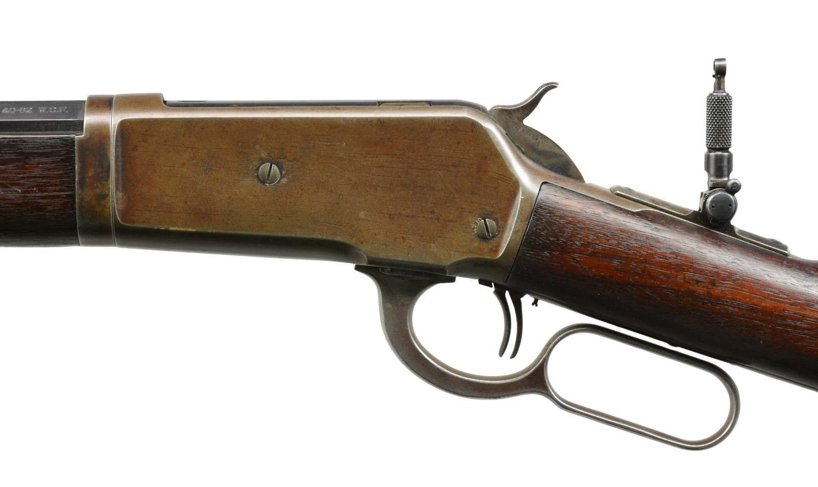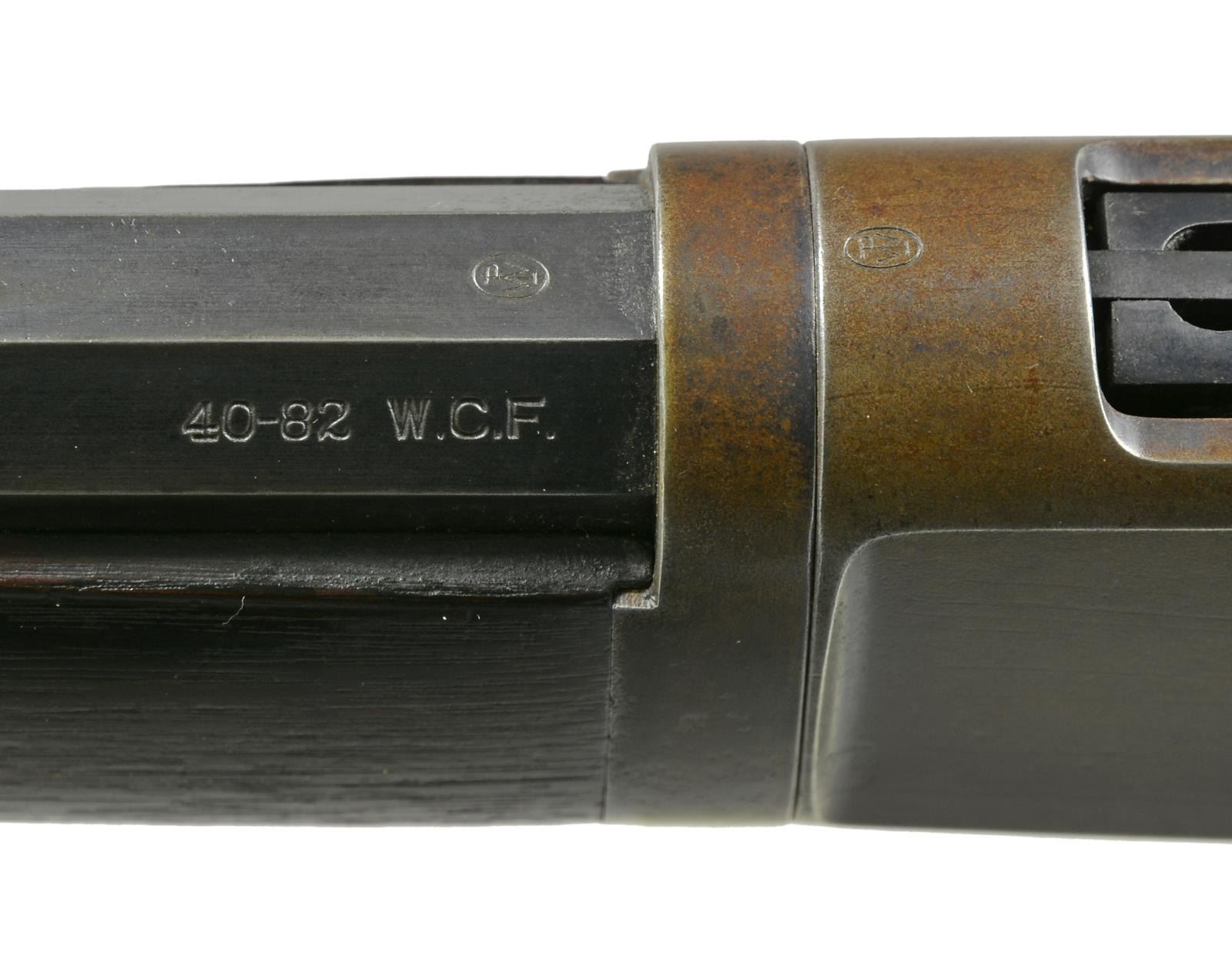 Cal. 40-82. S# 141149. Bbl. 26" oct. King No. 3 triple bead front sight, Win. sporting rear sight & combination tang sight. Full length mag. Dbl. set triggers. Blue finish w/ case colored hammer & lever. Walnut forearm & straight grip stock w/ crescent steel buttplate. UNATTACHED ACCESSORIES: Cody Firearms Museum letter providing the following information: "Rifle / 40/82 / Octagon barrel / Set trigger / Takedown / Receiver in the Warehouse on Novmeber 3, 1908 / Shipping from the warehouse on November 4, 1908 / Returned and repaired on October 21, 1909". CONDITION: bbl. & mag. tube retain 85% lightly faded blue showing edge wear & spots of freckling. Action finish is fading to a light gray brown patina. Hammer & lever retain faint traces of case colors. Stock & forearm have dark open pored refinish showing scattered scratches & marks. Sound mechanics. Bore has slightly darkened appearance w/ lightly worn rifling. (20-1765). CURIO. $3,000-5,000.