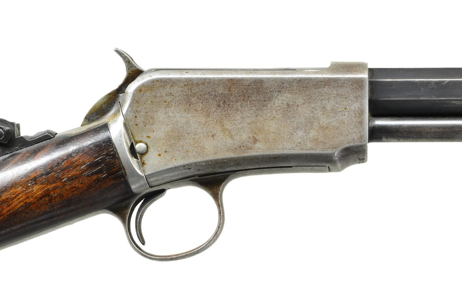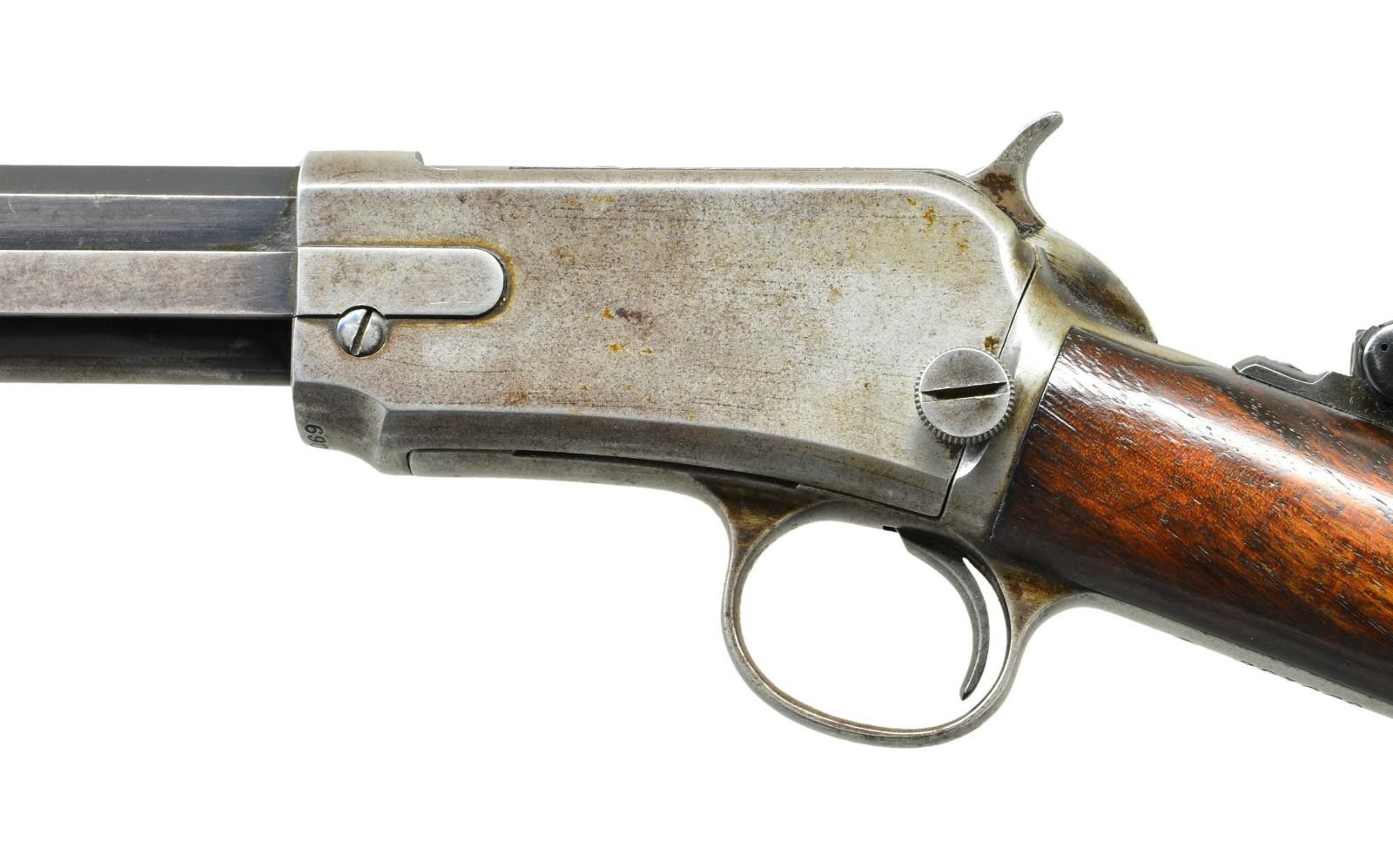 Cal. 22 WRF. S# 321069. Bbl. 24"octagon. Replacement bead front, filler in rear dovetail w/ Lyman combination tang sight. 2nd model action w/ mortised breech block. Grooved walnut slide handle & straight grip stock w/ crescent steel butt plate. Mfg. 1907. CONDITION: Bbl & mag. tube retain 40% dull faded blue. Action has faded to gray. Replacement top tang screw has copper washer to fit tang sight. Wood shows finish wear, age darkening & handling marks. Dark lightly pitted bore. (21-4101/DS). CURIO. $600-900.