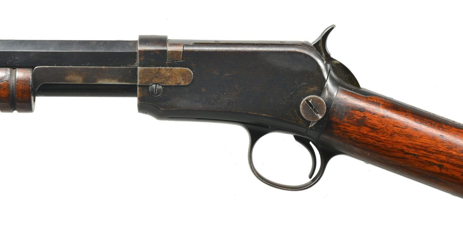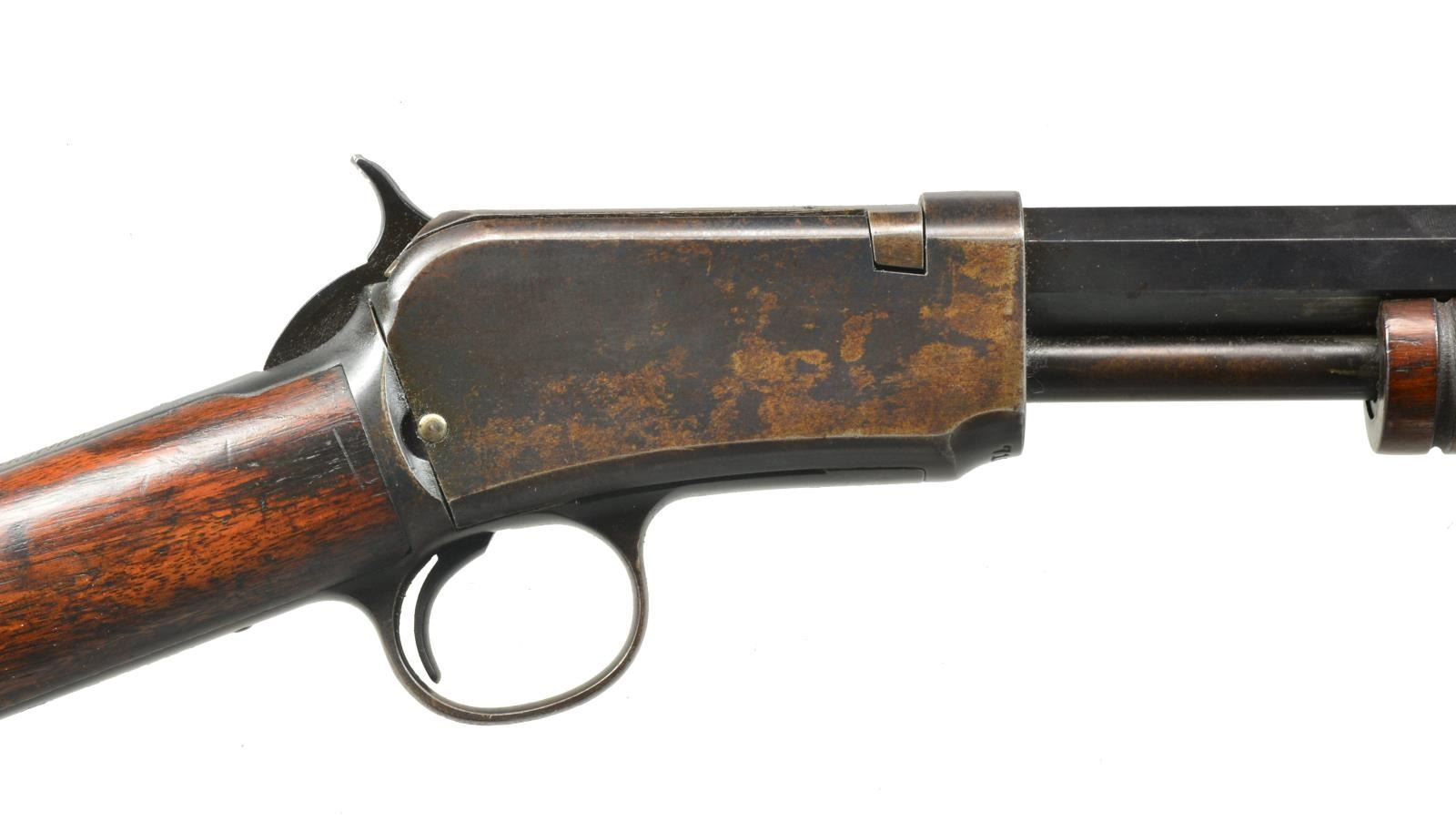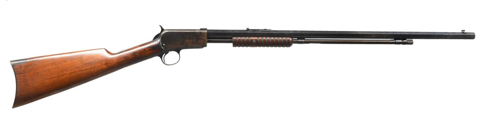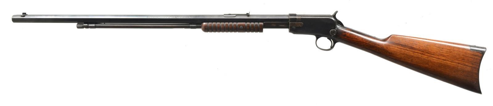 Cal. 22 Short. S# 716802. Bbl. 24" oct. Dovetail bead front, screw on adjustable rear sight. 12 Ring forend. Uncheckered straight grip stock w/ steel crescent buttplate. CONDITION: bbl. retains most of its original blue w/ some minor sharp edge wear & minor muzzle wear. Mag. tube has turned to a blend w/ brown patina. Receiver has original blue w/ minor flaking on right side w/ brown patina & minor sharp edge wear. Forend has original finish w/ some minor flaking. Buttstock has original finish w/ a few minor scratches & hand wear in grip area. Bore is good. (20-3138/BT). CURIO. $500-800.