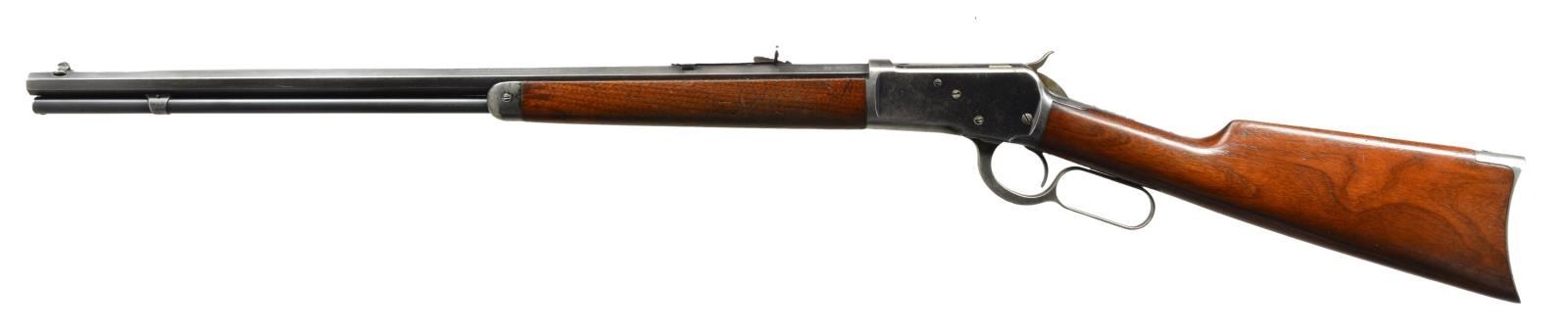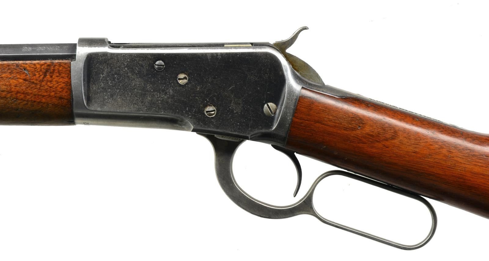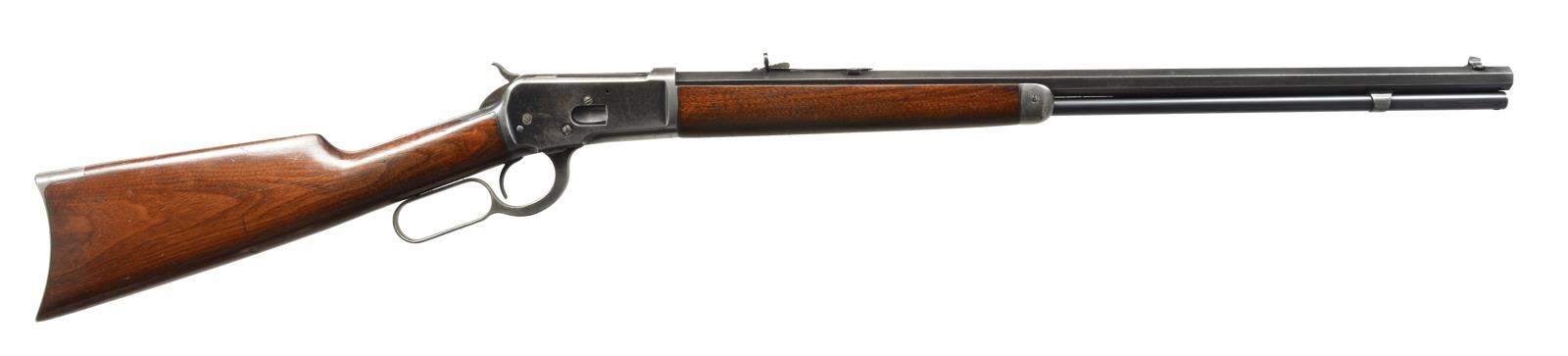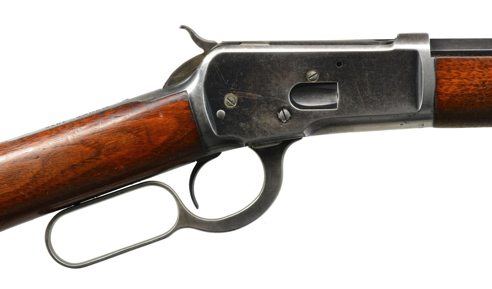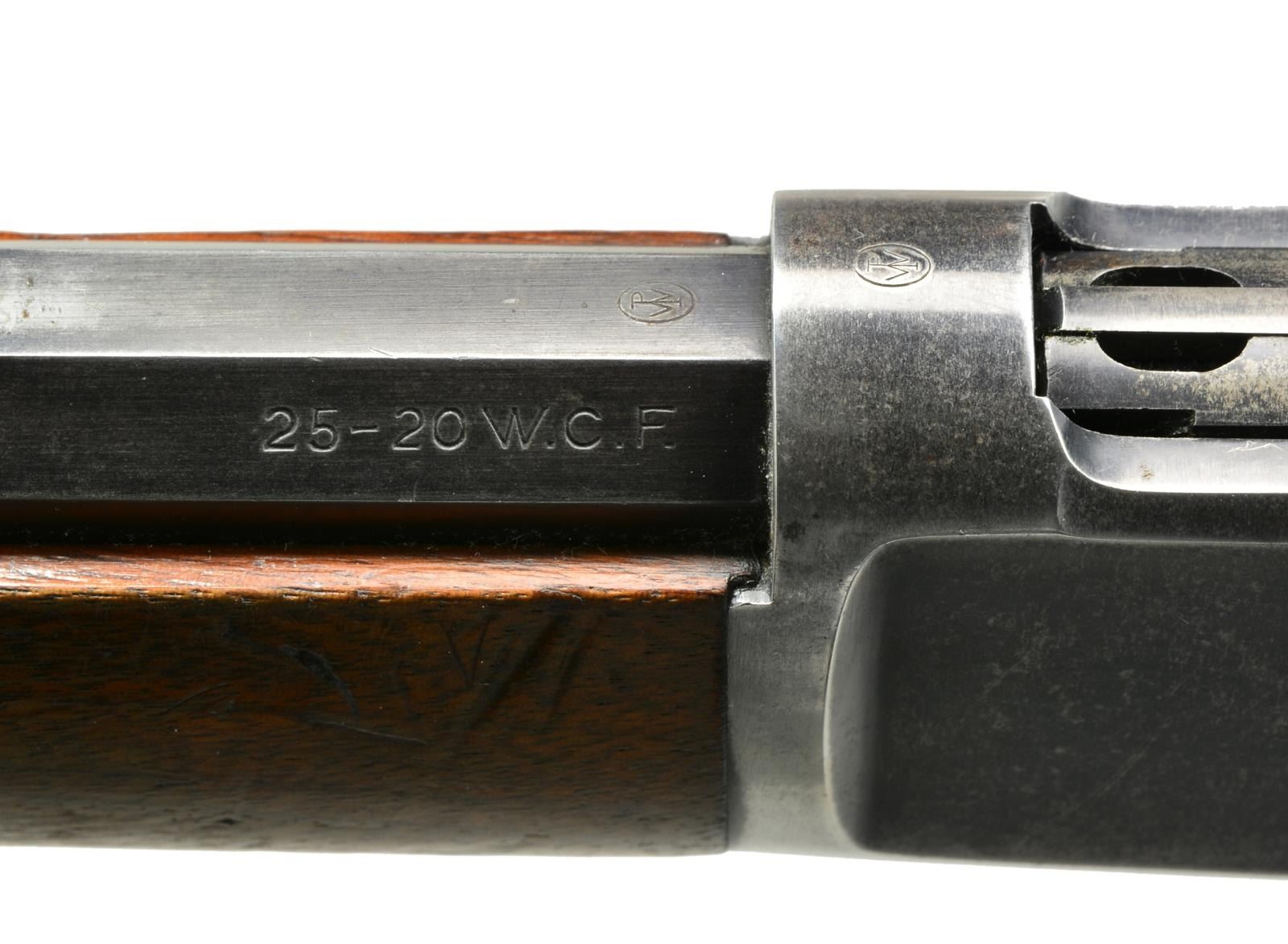 Cal. 25-20 WCF. S# 776702. Bbl. 24" oct. w/ sporting front sight & elevator adj. sporting rear sight. Full length mag. Blue finish w/ case colored lever & hammer. Walnut forearm & straight grip stock w/ crescent steel buttplate. 1915 Mfg. CONDITION: bbl. & mag. tube retain over 80% lightly faded blue showing edge wear. Receiver retains 40% fading blue showing spots of flaking & wear in carry areas. Hammer & lever retain some lightly visible case colors. Stocks have worn original finish showing scattered scratches, marks & sm. dents. Sound mechanics. Bore is bright w/ sound rifling showing a few sm. spots of light pitting near muzzle. (20-1897/DS). CURIO. $1,500-2,000.