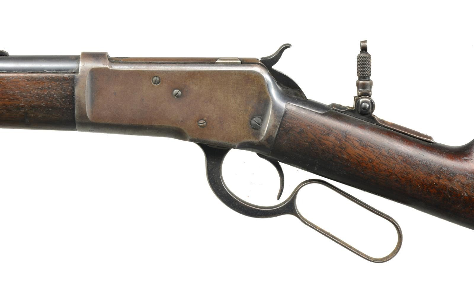 Cal. 32 WCF (32-20). S# 145204. Bbl. 24" rnd. Combination front sight, sporting rear sight & combination tang sight. Full length mag. Walnut forearm & straight grip stock w/ crescent steel buttplate. 1897 Mfg. CONDITION: bbl. & mag. tube retain 60% dull lightly faded blue showing spots of surface corrosion. Action retains sm. amount of blue in protected areas w/ balance fading to brown. Wood has dark worn appearance showing numerous scratches, dents & marks. Bright bore w/ strong rifling. (01-18409/DS). ANTIQUE. $1,400-1,800.
