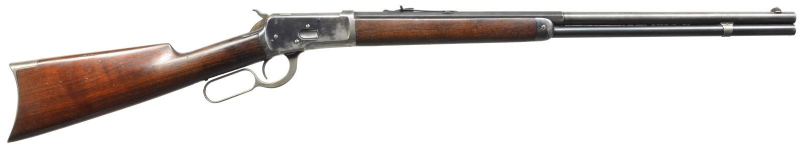 Cal. 38 WCF. S# 443736. Bbl. 24" oct. to rnd. w/ a Lyman No. 4 Hunting ivory bead front sight & original flat top sporting rear sight. Full length mag. Blue finish w/ case colored lever. Bottom of receiver forward of locking lugs has sm. stamped numbers "71", "41" & "21" that may be owner identification marks. Walnut forearm & straight grip stock w/ crescent steel buttplate. 1908 Mfg. CONDITION: bbl. & action retain 70% lightly faded blue showing carry wear. Lever retains traces of case colors. Wood has age darkened appearance w/ worn finish showing dents, scratches & marks. Stock has sm. chips either side of top & bottom tangs. Bore retains strong lightly worn rifling. (20-4196/DS). CURIO. $1,350-1,900.