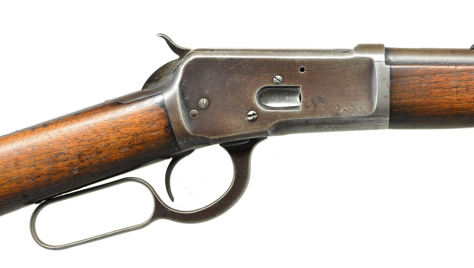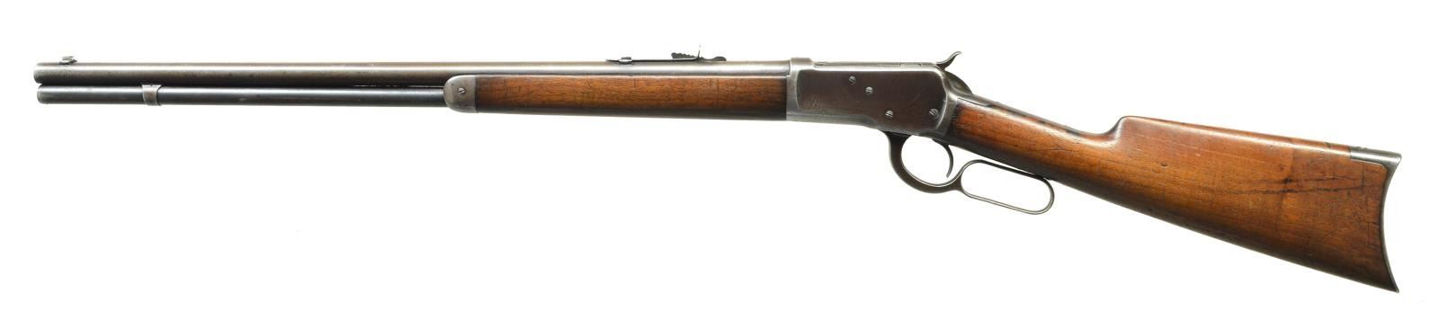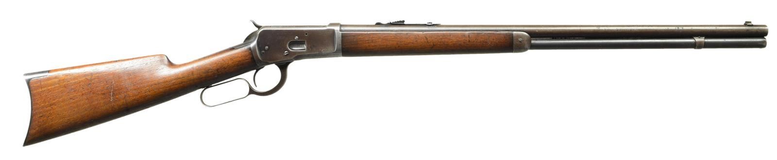 Cal. 38 WCF (38-40). S# 382762. Bbl. 24" round with replacement blade front sight and Marbles elevator adjustable rear sight. Barrel and receiver have "WP" proofs. Full length mag. Walnut forearm and straight grip stock with crescent steel buttplate. Mfg. 1907. CONDITION: metal has a faded brown appearance with scattered spots of pitting having dents on both sides of receiver. Wood has worn appearance showing numerous scratches, dents and marks. Some action screws show screwdriver distortion. Lightly pitted bore retains sound rifling. (22-4038/DS). CURIO. $700-1,000.