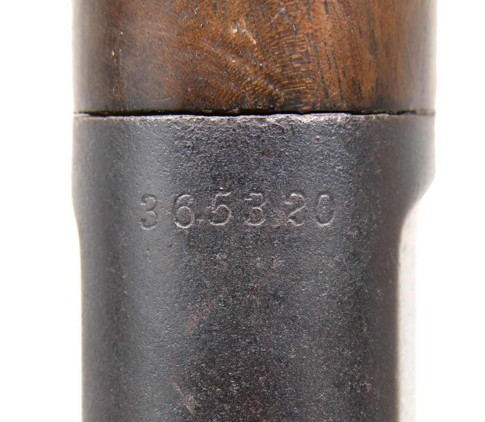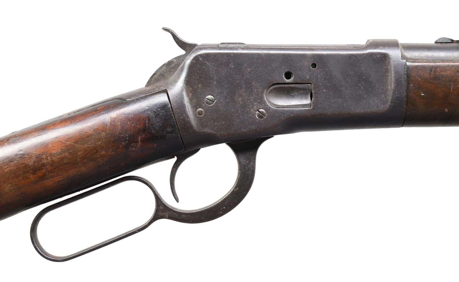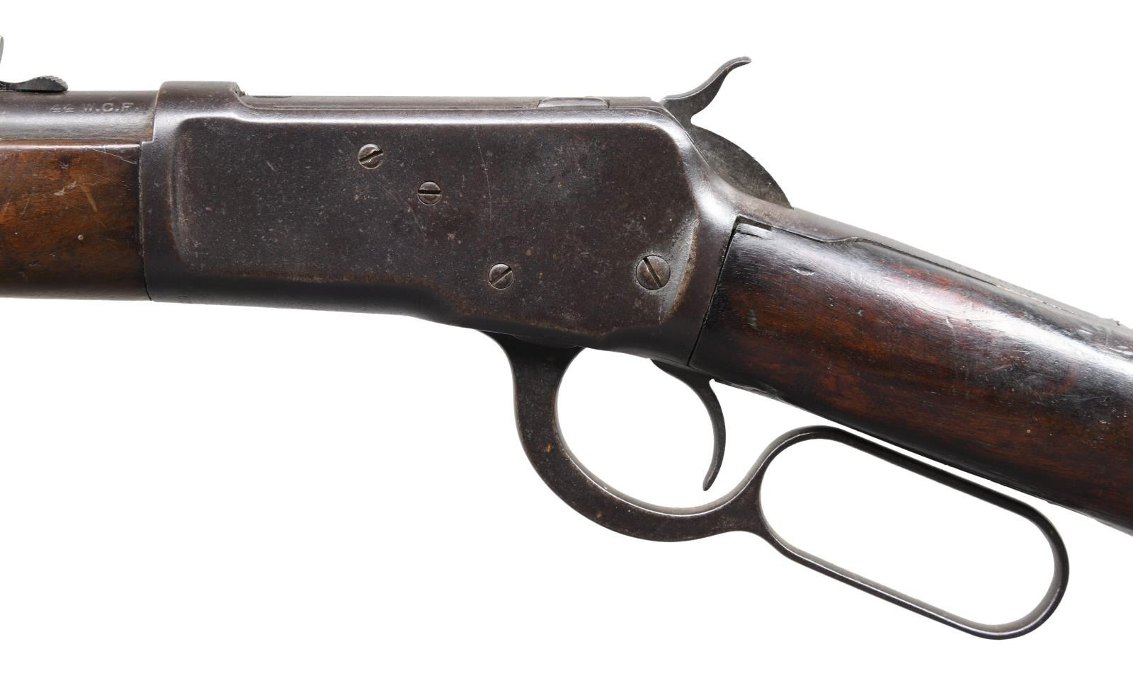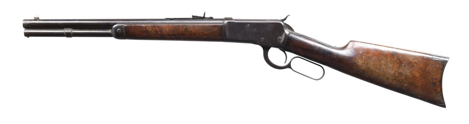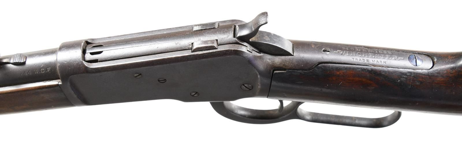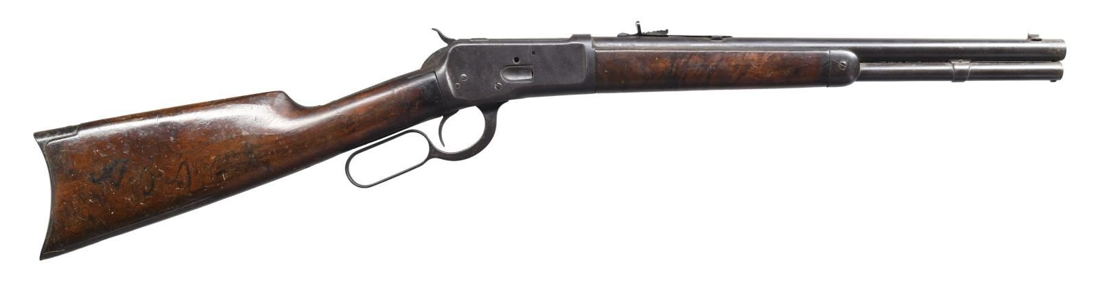 Cal. 44 WCF (44-40). S# 365320. Bbl. 16" round, 8" shorter than standard. Sporting front sight w/ replacement sporting rear sight. Full length mag. 7 3/8" short rifle forearm, 2" shorter than standard. Right side of stock has painted marking that is hard to read. Straight grip walnut stock w/ crescent steel buttplate. Mfg. 1906. CONDITION: metal has faded to brown showing heavy wear & scattered pitting. Replacement rear sight is reblued. Wood has added finish over dents & handling marks. Dark bore w/ worn rifling having a ring approx. 4" from muzzle. (24-764/DS). CURIO. $3,750-5,500