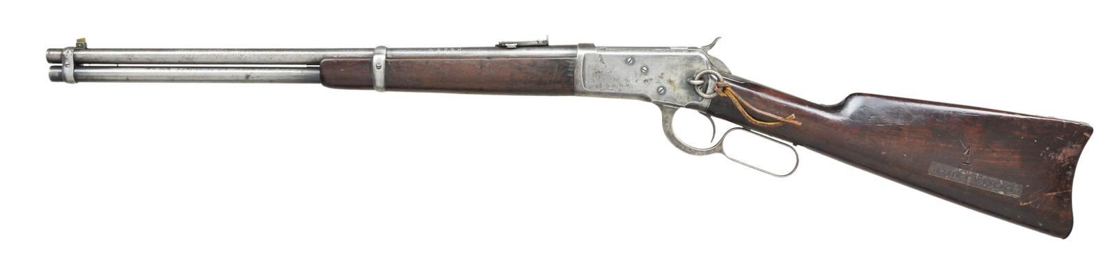 Cal. 44 WCF (44-40). S# 320886. Bbl. 20" carbine style. Replacement pinned brass blade front sight with carbine leaf rear sight. Full length mag. Action has saddle ring with leather thong on left side. Band fastened gumwood forend & straight grip stock with steel carbine buttplate. Left side of receiver & toeline of stock are stamped with possible department marking "D275D".Left side of stock has carved "!" over a plastic label marked "DIRTY DOG". Mfg. 1906. CONDITION: Metal has faded to gray showing areas of dark corrosion. Wood has added finish over wear and numerous dents & marks. Bright bore shows strong rifling. (22-3516/DS). CURIO. $1000-1500.