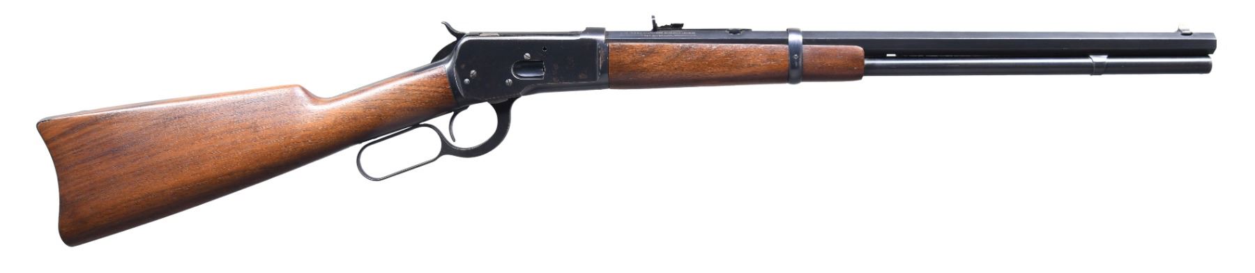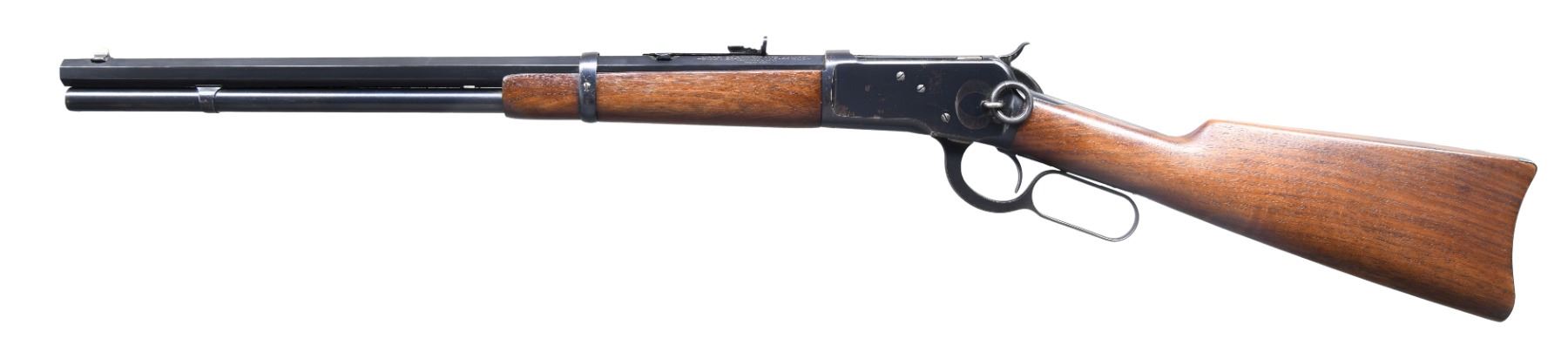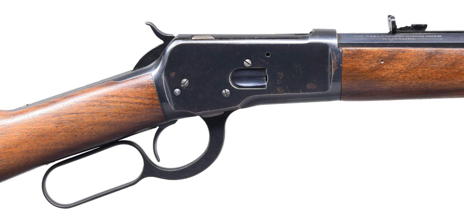 RIFLE. Cal. 44 WCF. S# 979130. Apparently originally built as a trapper length carbine, this unusual rifle has been altered w/ a replacement rifle bbl. & appropriate length magazine. Bbl. 20" octagon having an open slot on bottom flat for rifle forearm cap tenon. Top flat has standard "WP" proof mark w/ circle "P" parts proof. Sporting front sight w/ elevator adj. rear sight stamped "PAT. FEB. 22,27". Full length tubular mag. Action has saddle ring on left side. Blue finished. Band fastened 7 7/8" trapper length carbine forearm w/ straight grip carbine stock & steel carbine buttplate. Mfg. 1927. CONDITION: fine. Bbl. & mag. tube retain 98% blue. Action has 85% blue, showing spotted wear & flaking. Stocks have lightly worn finish. Bright near excellent bore. (25-739/DS). CURIO. $4,000-6,000.
