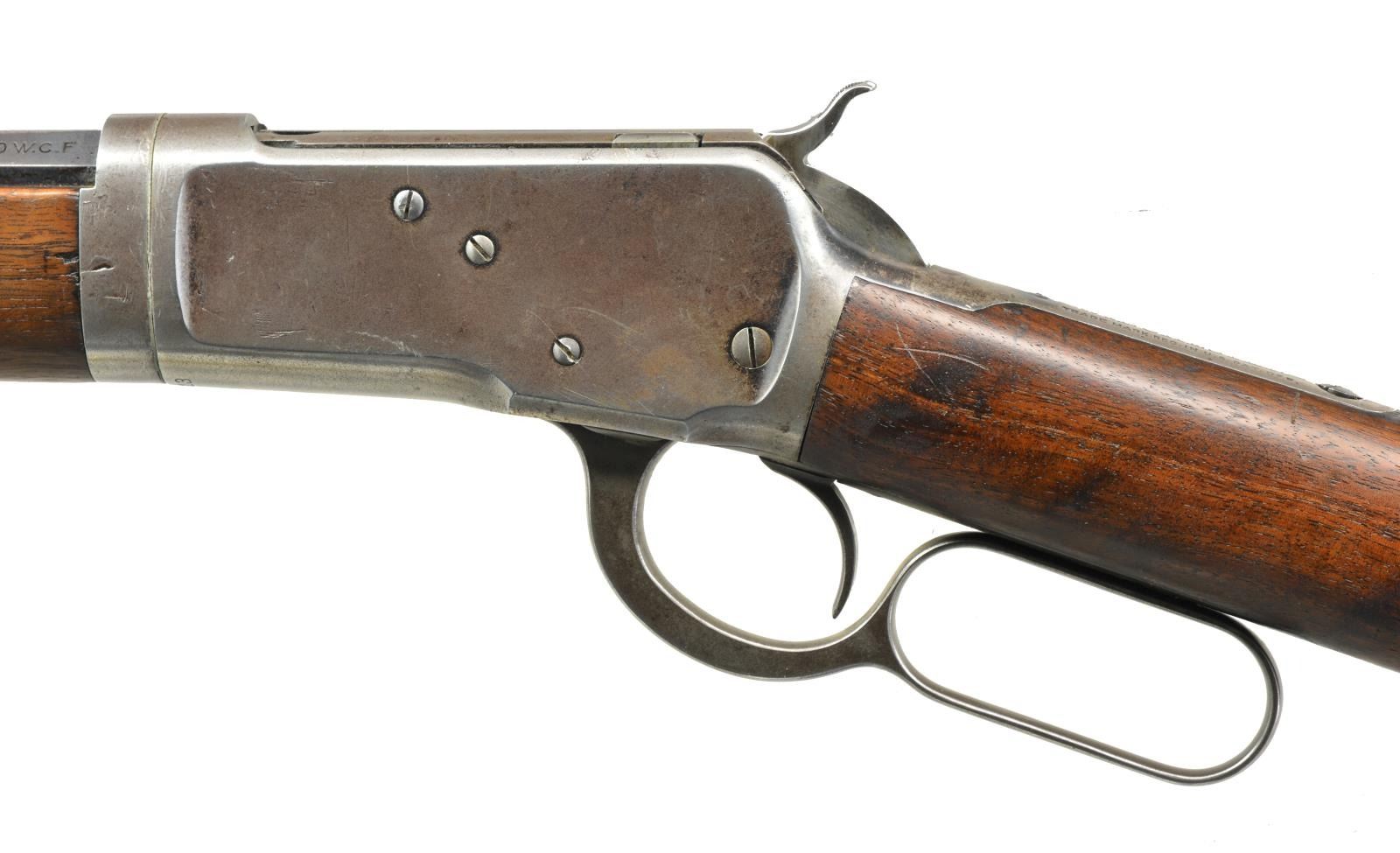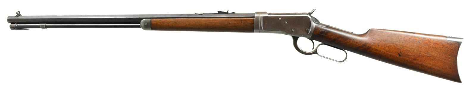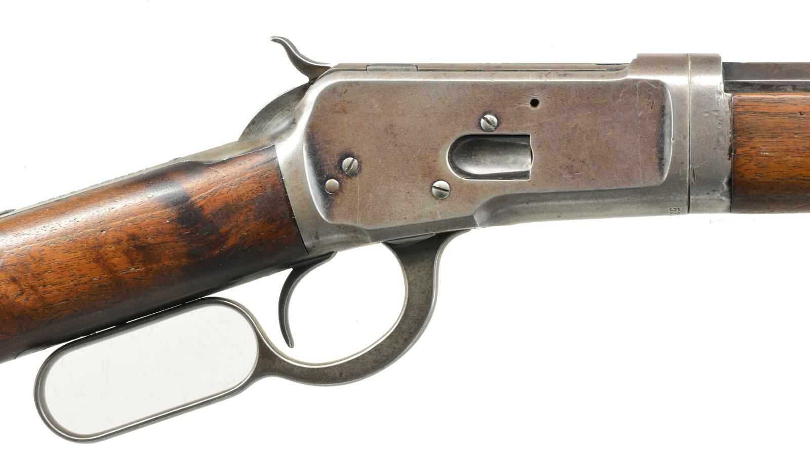 Cal. 25-20. S# 532913. Bbl. 24" oct. w/ combination front sight & flat top sporting rear sight. Full length takedown mag. Walnut forearm & straight grip stock w/ crescent steel buttplate. Mfg. 1910. CONDITION: bbl. & mag. tube retain 60% dull worn blue showing spots of corrosion w/ sm. dents on edges of bbl. flats. Action has faded to gray w/ scattered light pitting having numerous dents on forward part of receiver & bbl. extension. Wood has worn aged appearance w/ numerous scratches & handling marks having sm. crack behind top tang. Stock screw is a non proper replacement. Good mechanics. Bore has slightly darkened appearance w/ sound rifling. (20-2308/DS). CURIO. $750-1,000.