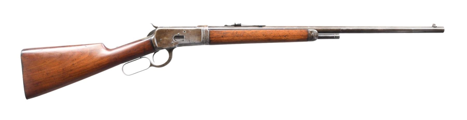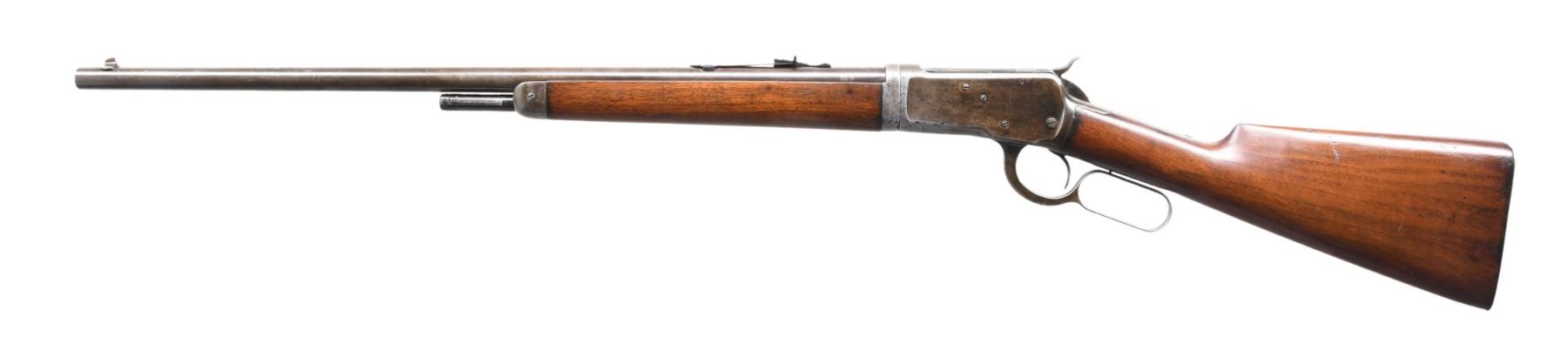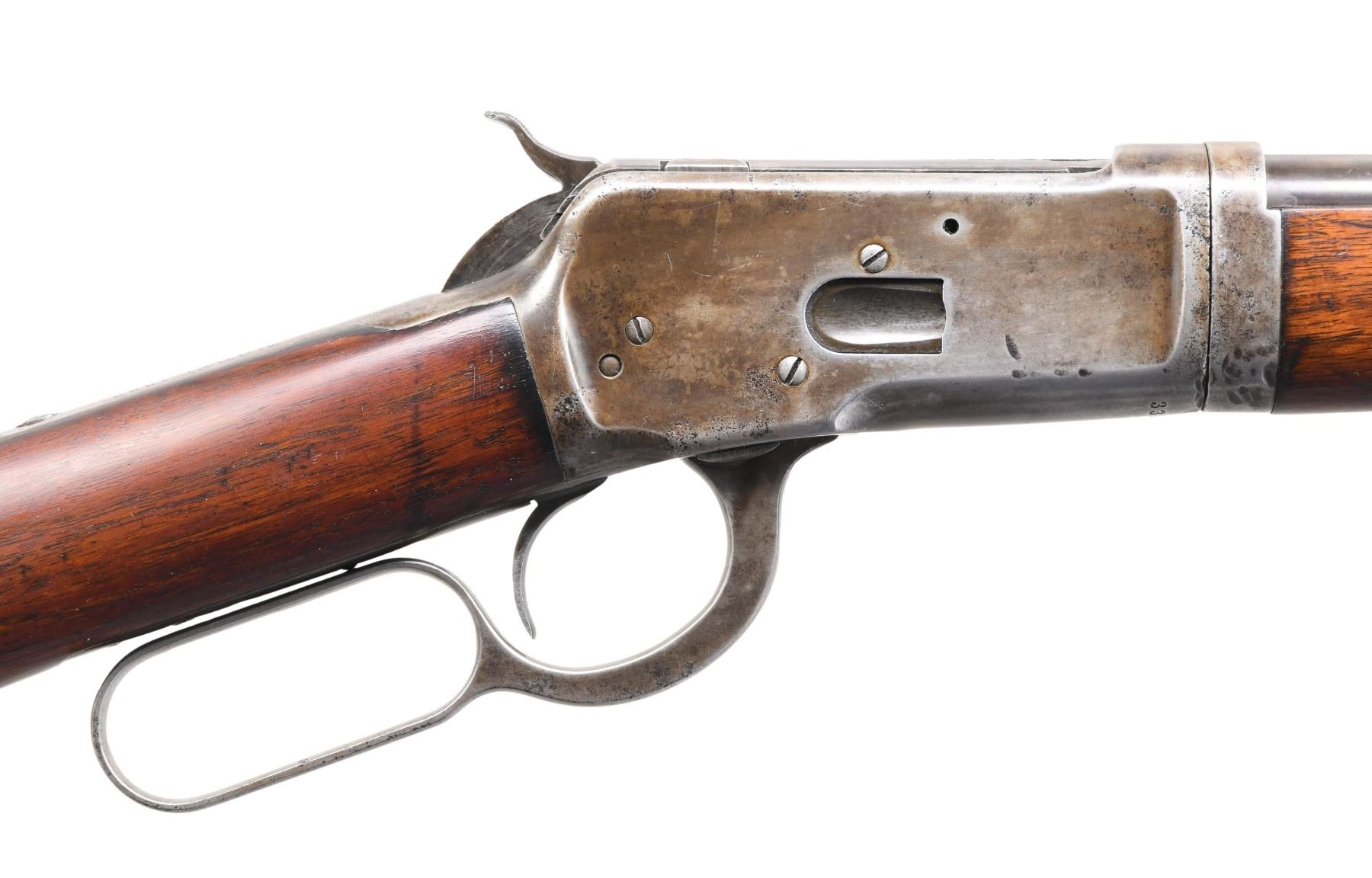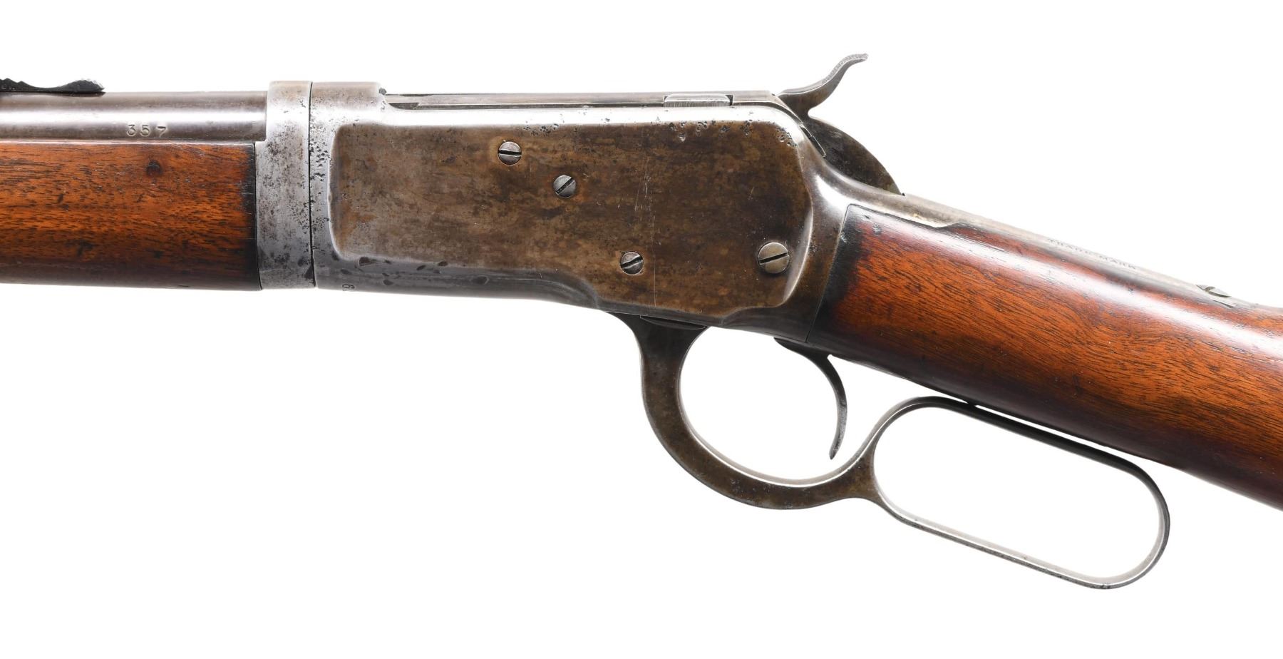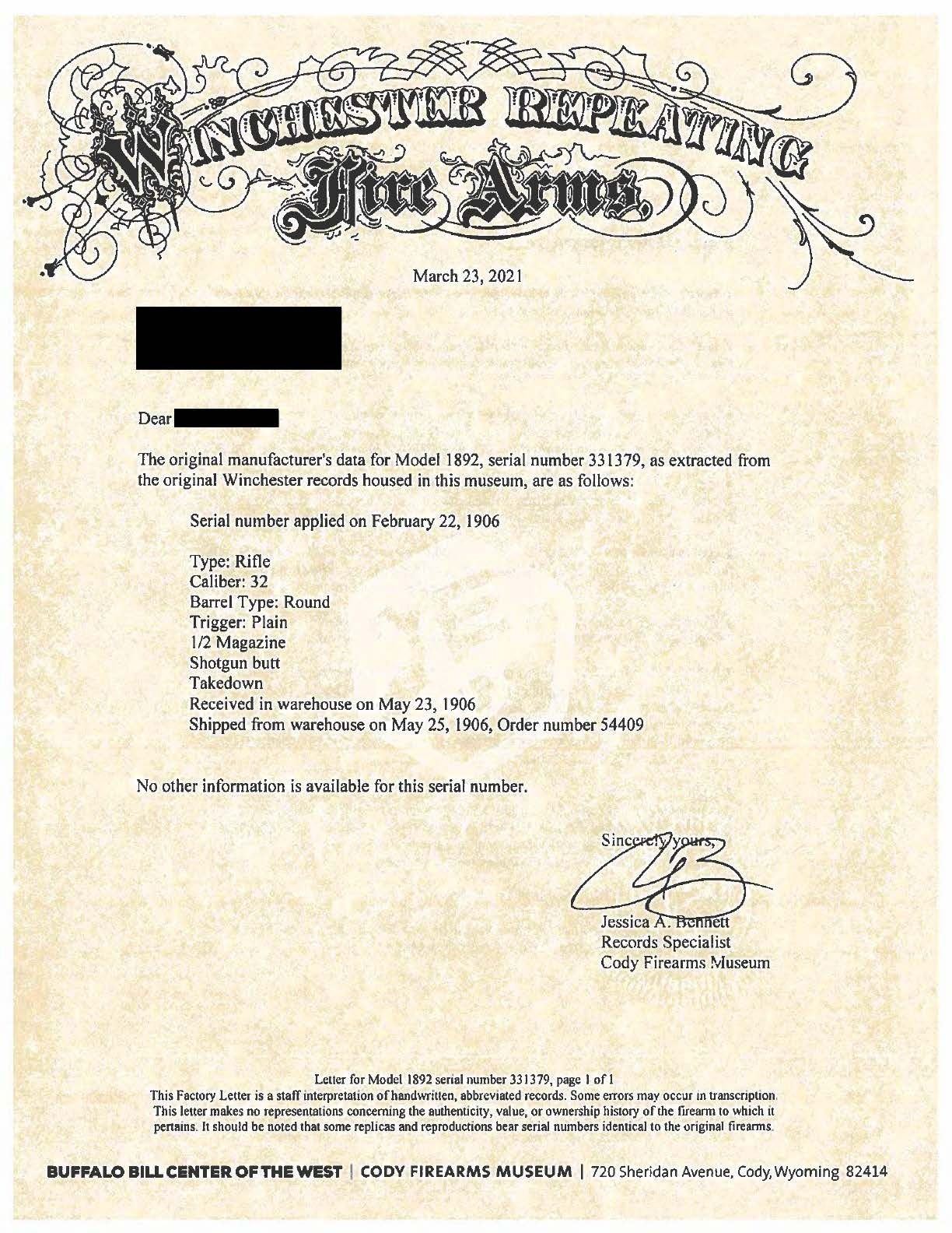Cal. rechambered, rebored & remarked to 357 Magnum. Original cal. was 32 WCF. S# 331379. Bbl. 24" round, shortened to 24 1/4". Original style sporting front sight w/ flat top sporting rear sight. Half-length takedown mag. Walnut forearm & straight grip stock w/ steel shotgun buttplate. UNATTACHED ACCESSORIES: letter from the Cody Firearms Museum detailing the following information, "Serial number applied on February 22, 1906 / Type: Rifle / Caliber: 32 / Barrel Type: Round / Trigger: Plain / 1/2 Magazine / Shotgun butt / Takedown / Received in warehouse on May 23, 1906 / Shipped from warehouse on May 25, 1906, Order number 54409". CONDITION: bbl. shows 60% dull fading blue. Action finish has largely faded to gray showing spots of pitting w/ heavy dents on frame & bbl. extension. Lightly refinished wood shows scratches & marks. Bore retains strong rifling. (24-3935/DS). CURIO. $600-900.
