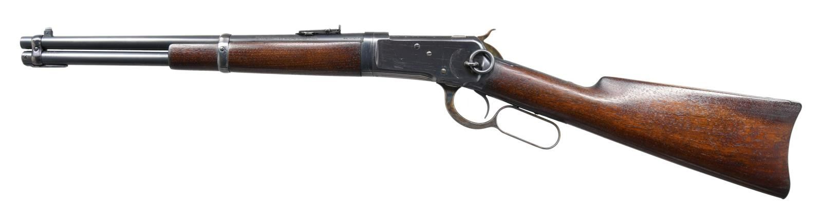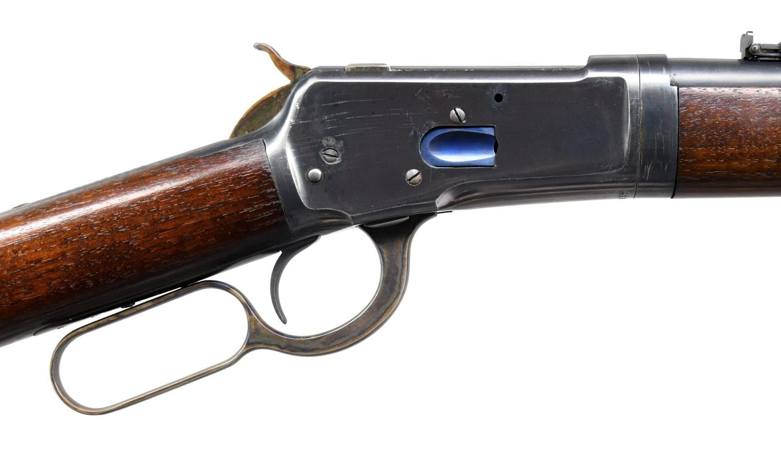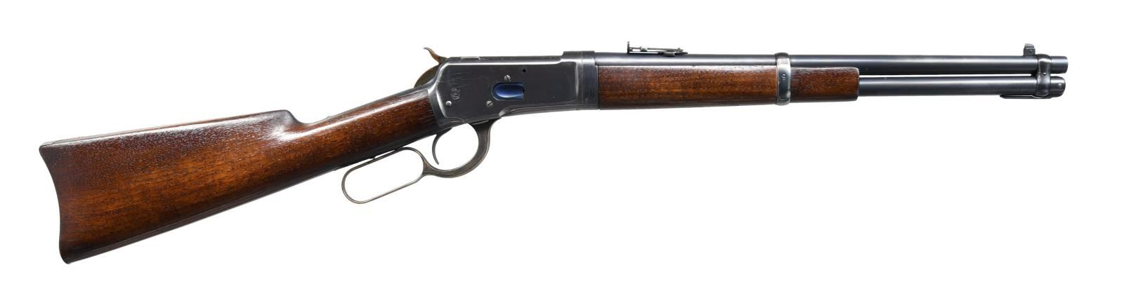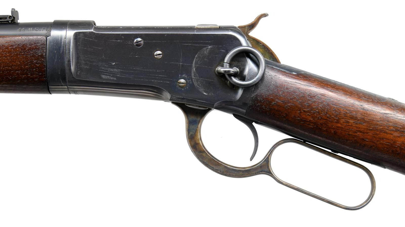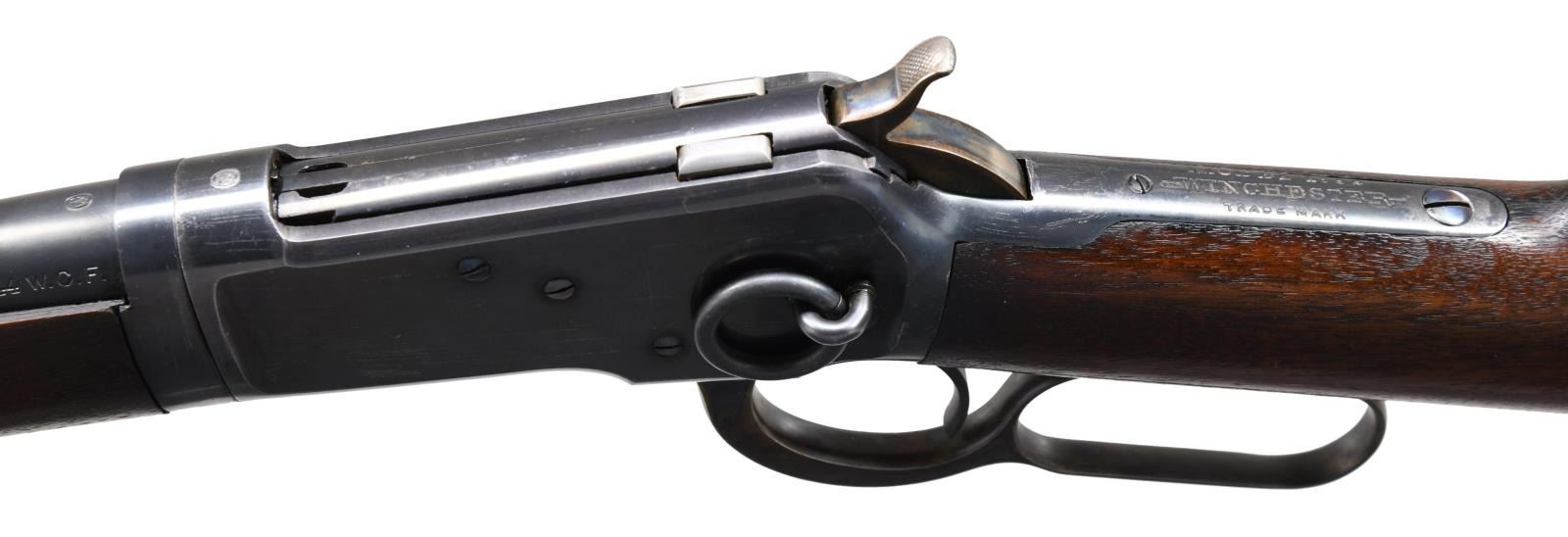 SRC. Cal. 44 WCF (44-40). S# 418206. Bbl. 16" w/ pinned blade front sight & carbine leaf rear sight. Full length takedown mag. Action has saddle ring on left side. Blue finished w/ case colored hammer, lever & buttplate. Replacement 8 1/4" trapper style forearm. Replacement straight grip stock w/ steel carbine buttplate. Mfg. 1907. UNATTACHED ACCESSORIES: letter from the Cody Firearms Records Office detailing the following information, "Serial number applied on January 25, 1908 / Configuration records not available". CONDITION: beautifully restored carbine . Over 95% blue showing edge wear & marks on action. 97% case colors showing edge wear. Markings are recut. Wood has very good open grain finish. Hammer follows the bolt when closing the action. Very good bright bore. PROVENANCE: The Collection of Edward Scott Meadows. (24-716/DS). CURIO. $5,000-7,000.