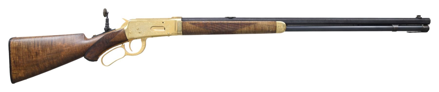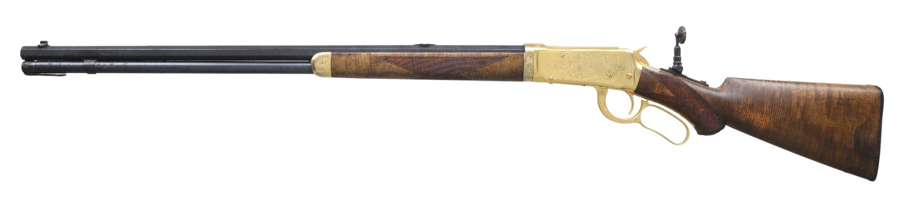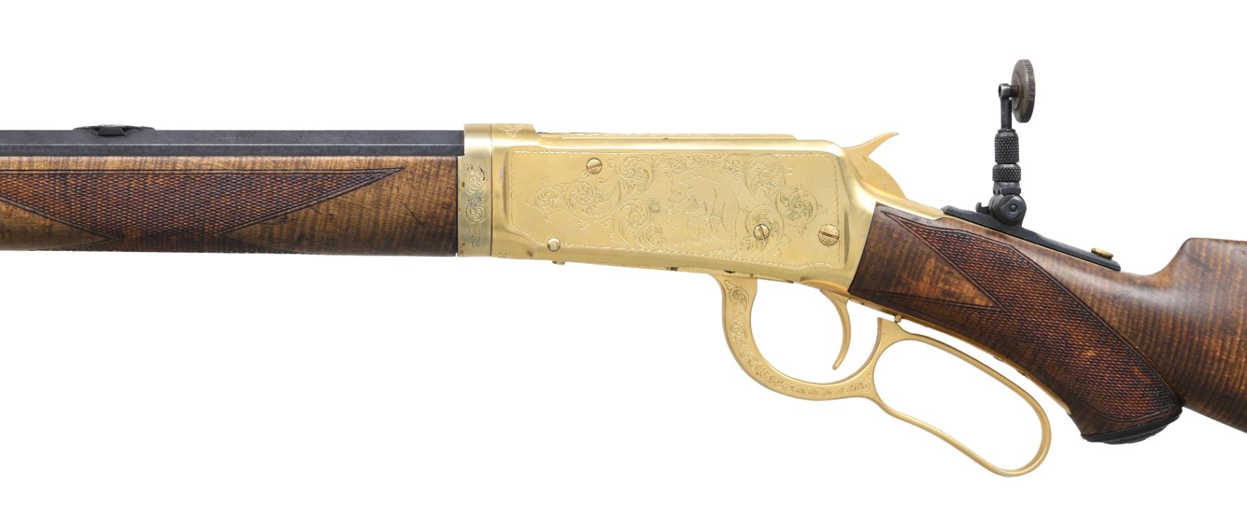 LEVER ACTION RIFLE. Cal. 32 WS. S# 234961. Bbl. 26" takedown octagon. Replacement bead front sight. Filler in rear dovetail w/ combination tang sight. Full length mag. Custom unsigned aftermarket engraving features a running elk on the right side w/ a bear on the left. Scenes are surrounded by vine type foliate scroll w/ straight line & punch dot borders. Complimentary engraving extends to upper & lower receiver areas, lever, receiver extension & forearm cap. Action & forearm cap have gold finish. Forearm & hard rubber capped pistol grip stock of maple having tight fiddle figure. Features include style H checkering & hard rubber shotgun buttplate. Left inside of lower tang is stamped w/ assembly number "19426". UNATTACHED ACCESSORIES: Cody Firearms Museum Records Office letter, "SN applied: 8-31-1904 / Date In: 9-6-1904 / Rifle / Caliber/Gauge: 32 WS / Bbl Shape: Oct / Trigger: Plain / Stock: Checker Stock Pistol Grip / Butt: Shotgun-Rubber / Other Features: TD / Maple wood furnished by customer / Date Shipped: 9-10-1904 / Order #: 239908". CONDITION: bbl. & mag. tube retain 60% fading blue, showing spots of corrosion & light pitting. Action has 95% gold finish. Refinished wood has a red-toned non-gloss appearance. Stock is missing a small chip right of top tang. Bore is dark w/ worn rifling. (25-203/DS). CURIO. $2,000-3,000.
