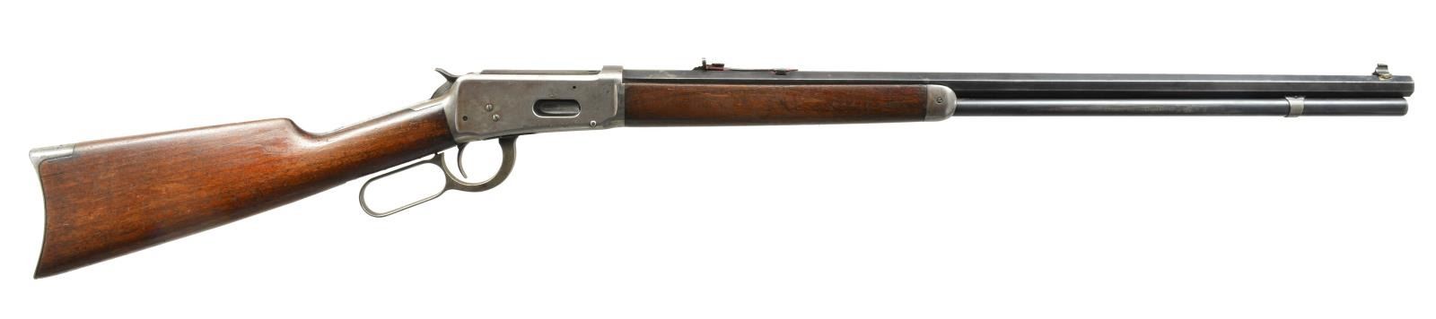 Cal. 32 WS. S# 663560. Bbl. 26" oct. Marbles replacement front sight w/ broken bead & original flat top sporting rear sight. Full length mag. Walnut forearm & straight grip stock w/ crescent steel buttplate. 1913 Mfg. CONDITION: bbl. & mag. tube retain 50% dull fading blue showing spots of light pitting. Action has cleaned gray appearance showing scattered pitting. Wood has added finish over dark worn appearance showing numerous dents & handling marks. Good mechanics. Bore has slightly darkened appearance retaining strong rifling. (20-2311/DS). CURIO. $700-1,000.