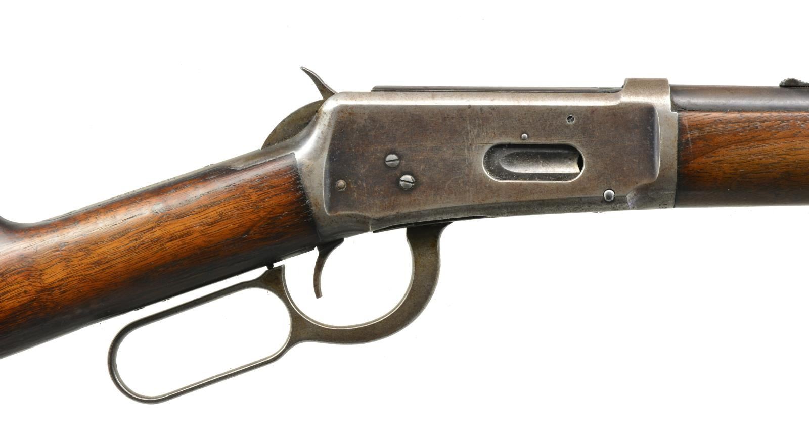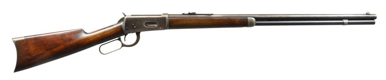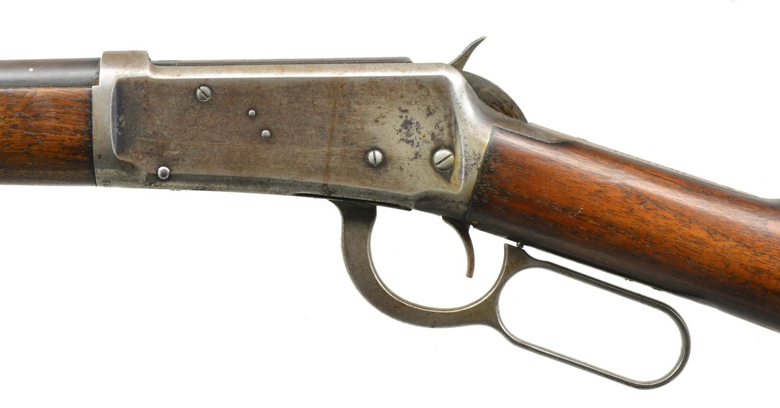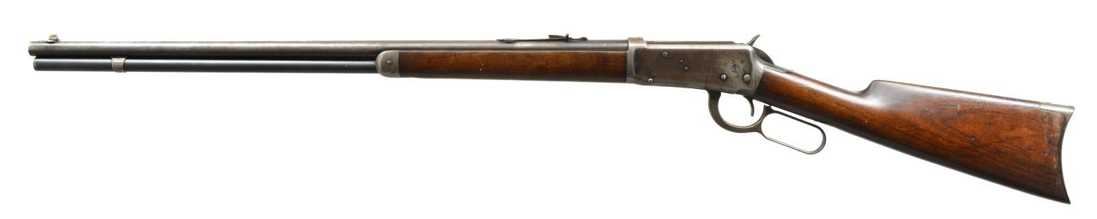 Cal. 32-40. S# 193799. Bbl. 26" rnd. w/ sporting front sight having replacement brass blade & elevator adj. sporting rear sight ground to flat top configuration. Full length mag. Walnut forearm & straight grip stock w/ crescent steel buttplate. 1900 Mfg. CONDITION: bbl. & mag. tube retain 60% dull worn blue showing spots of corrosion. Action has some worn blue on sides w/ carry areas fading to gray showing spots of light pitting. Wood has dark worn appearance w/ scattered scratches & handling marks. Good mechanics. Bore is dark w/ worn rifling. (20-1986/DS). CURIO. $700-1,100.
