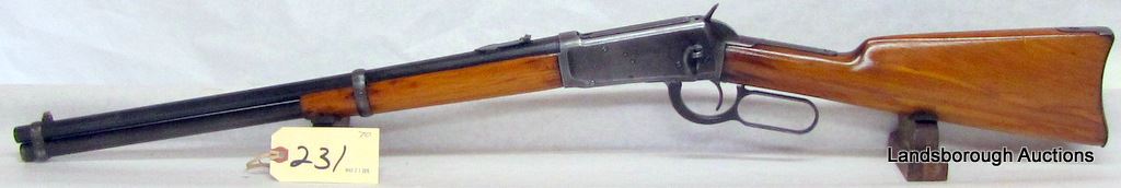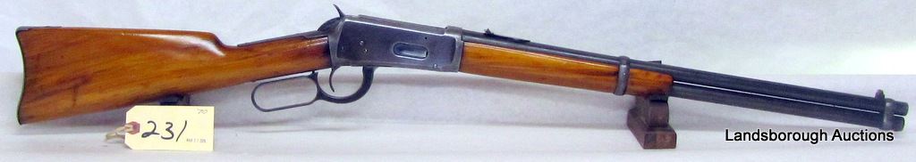 NON-RESTRICTED, LEVER ACTION, 32 WS, 20" BARREL, SN 432017. WOOD REFINISHED, BLUING GREY AND WORN, BORE PITTED. MFD 1908. BACKSIGHT BROKEN.