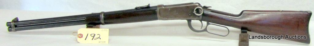 NON-RESTRICTED, LEVER ACTION, 30 WCF, 20" BARREL, SN 745549. WOOD HAS A FEW SCRATCHES AND CRACKED FOREARM, BLUING IS GREY ON BARREL, RECEIVER TURNING BROWN, BORE VERY GOOD. STAMPED CITY OF TORONTO ON BUTT STOCK, BRITISH PRROF MARK BEHIND REAR SIGHT. MFD 1914, SADDLE RING, INLAID COMPASS.