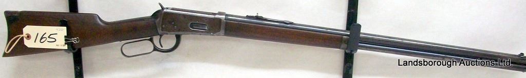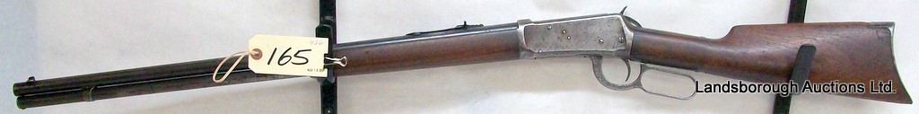 NON-RESTRICTED, LEVER ACTION, 32-40 WIN, 26" BARREL, SN 711160. WOOD BUTT STOCK DOES NOT FIT WELL, BLUING IS GREY AND WORN TURNING BROWN, BORE STAINED, RIFLING EVIDENT. UPPER TANG IS CRACKED AT HAMMER PORT. MFD 1914.