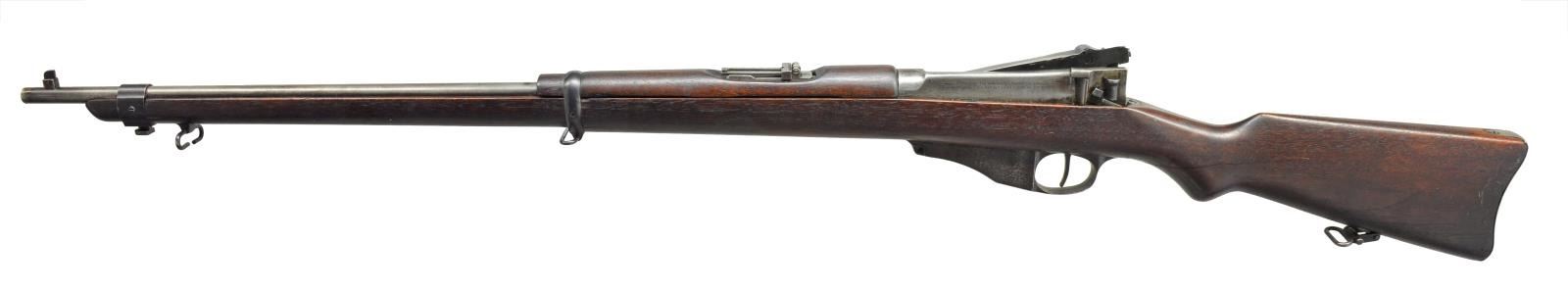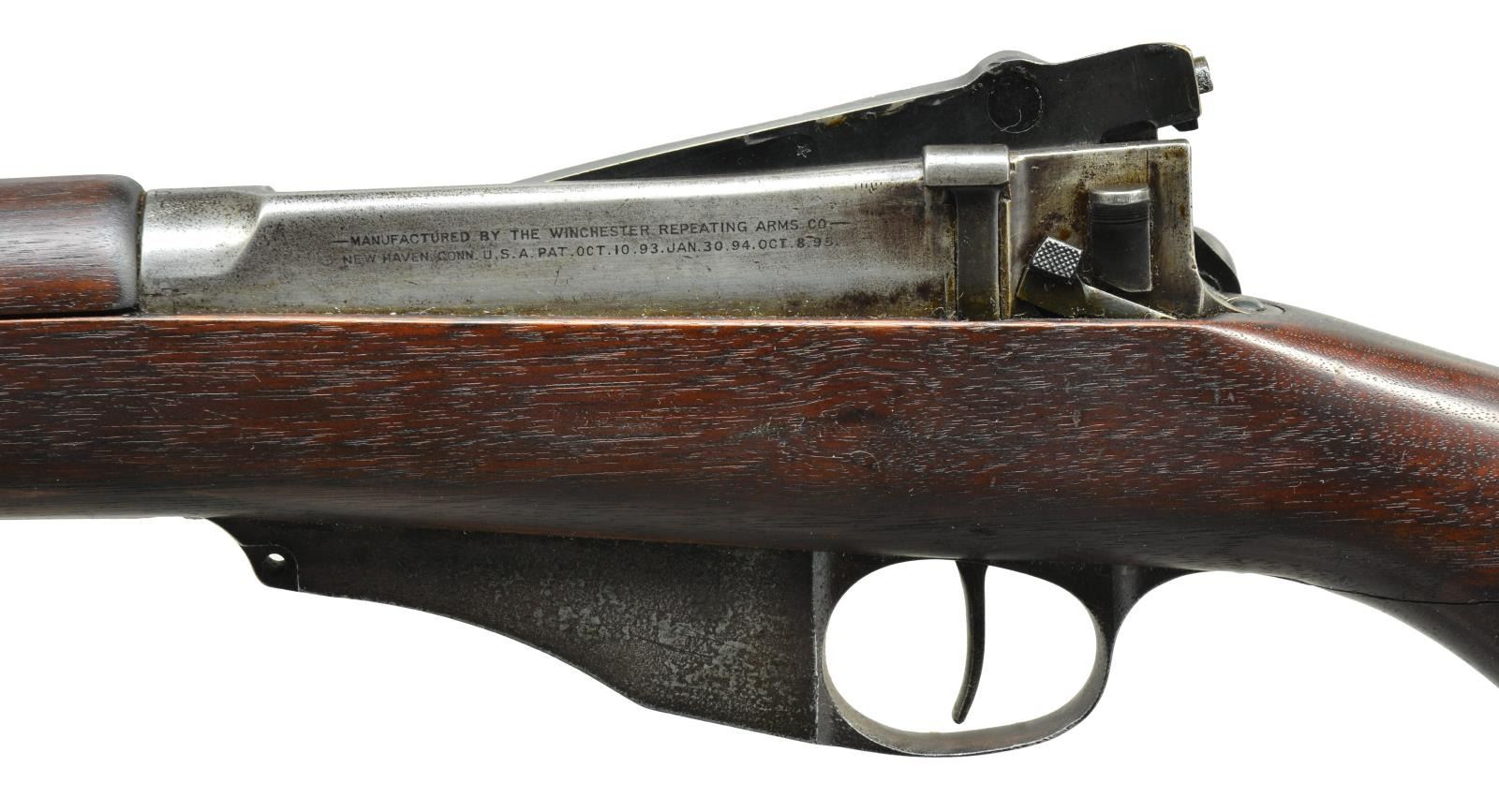 RIFLE W/ BAYONET. Cal. 6 mm LN. S# 7118. Bbl. 28". Ladder rear sight graduated to 2000 yds. Blade front sight. Straight pull action marked on left side of receiver "MANUFACTURED BY THE WINCHESTER REPEATING ARMS CO. NEW HAVEN, CONN. U.S.A. PAT. OCT. 10, 93 JAN. 30. 94, OCT. 8. 95". Receiver ring is marked on top w/ "U.S.N.- anchor" "No. 7118" "NCT" which is partly obscured due to fine pitting. Bolt is preproduction configuration & does not have the gas shield, however the gas escape hole in the top of the bolt is later round style. Receiver is from the first contract as it is inspected by Nathan Twining & does not have the screw on the left wall. Upper band has bayonet lug & stacking swivel. Walnut stock set. Butt has sliding trap. UNATTACHED ACCESSORIES: 81/8" fullered blade bayonet marked on right ricasso w/ "T" in triangle. Smooth walnut grips, metal is finished bright. Metal has been cleaned leaving very light oxidation, scattered fine pitting & staining. Grips have very light wear. CONDITION: stock has original finish w/ light wear, scratches & staining. Notable splotch of white paint on right forward end of forearm. Buttstock has large open crack extending from rear of trigger guard under grip upward toward heel. Crack is approx. 9" long. 2 Open cracks on forward end of hand guard beyond bbl. band. Worn metal has been cleaned, turning overall gray in patina w/ extensive fine pitting on receiver & trigger guard. Bolt has small file marks at rear. Dark bore w/ heavily worn lands. (01-19361/RW) (02-15293/RW). ANTIQUE. $1,750-2,500.