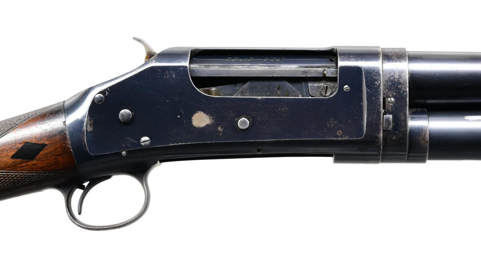 Cal. 12 ga. S# 455103. Bbl. 30" plain w/ fixed full choke & brass bead. Receiver has a matted top. Breech bolt is engraved "TRAP GUN". Blue finish. Small round forearm & straight grip stock of fancy walnut w/ wraparound hand checkering. Both sides of stock have black diamond inlays. LOP: 14 3/8" over the original deeply curved Winchester buttplate. Mfg. 1910. CONDITION: over 80% blue showing edge wear w/ scattered spots of finish loss & corrosion. Original wood shows moderate finish & checkering wear w/ scattered light scratches & marks. Sound action. Very good bright bore. (24-1795/DS). CURIO. $1,200-1,800.