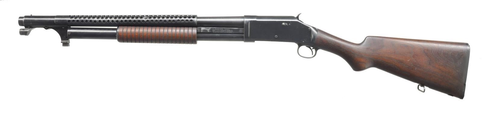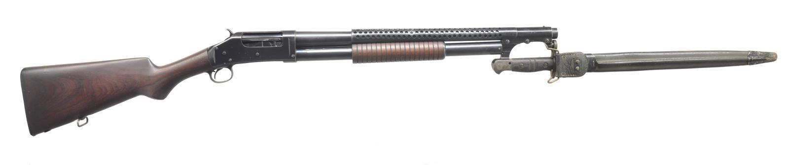 Cal. 12 Ga., 2 3/4". S# 687856. Bbl. 20" cyl. bore. Solid frame action. Commercial model w/out military marks. 6 Row handguard & bayonet lug. Grooved walnut pump handle. Pistol grip walnut stock w/ sling swivel & original buttplate having a brass ID tag marked "62" in toeline. UNATTACHED ACCESSORIES: Winchester marked 1917 bayonet w/ scabbard. Bayonet retains 30% fading parkerized finish w/ rust at hilt. Wood grips have age darkened appearance. CONDITION: over 90% original blue showing scattered scratches, marks & spots of corrosion. Wood has good finish showing light marks. Stock has sm. cracks extending from action w/ chip at bottom of grip. Very good bright bore. (20-3373/DS). CURIO. $2,000-2,750.